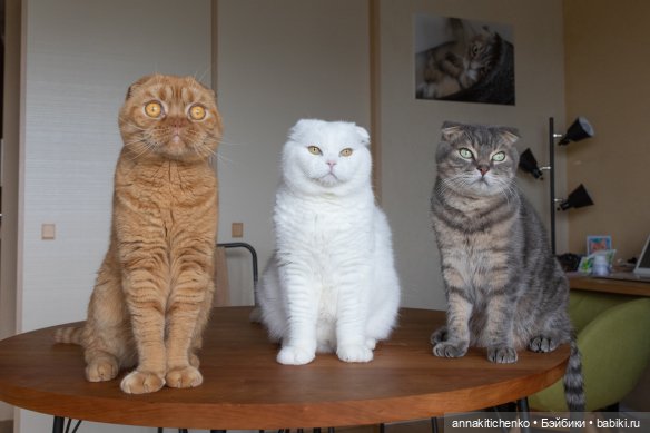 А это их шотландские вислоухие коты. Слева направо Mugi (Муги), Maru (Мару) и Nya (Ния)