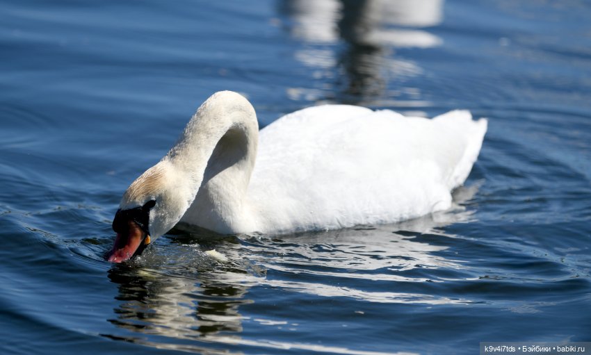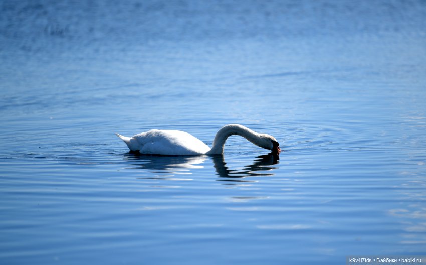 Этот лебедь нырял за водорослями, либо за рыбкой.