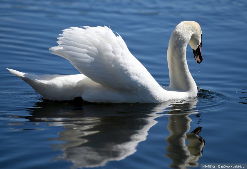 Это редкий вид птиц — Лебедь-шипун! У него клюв оранжево-красный и шикарный нарост чёрного цвета над ним. Из семи видов лебедей, шипун — самый крупный!