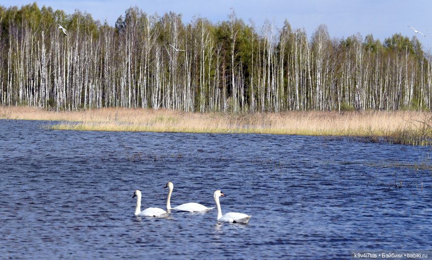 Лебеди до сих пор у нас. Вчера ходили кормить их. Были ещё лысухи и какая-то птица с хохолком. Пролетела над нами цапля.