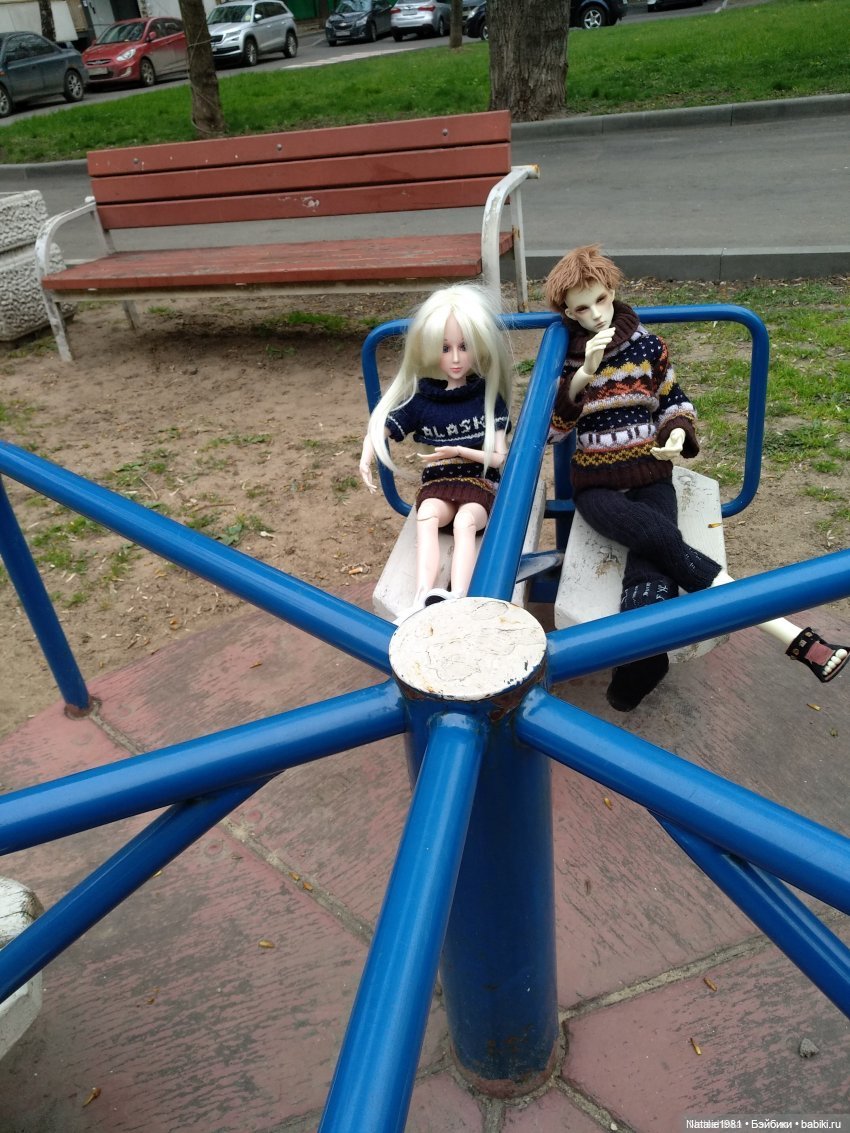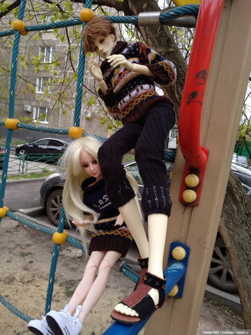 Но образ в целом? Топ-поддергайка на девушке, совершенно не подходящая к нему юбка (из носка?). РЕЙТУЗЫ у парня — это ж шедевр!!! Их явно носили прадедушка, дедушка и папа парня, аж на ноге уже перекрутились, да и по размеру — коротки :))) К свитеру не подходят, и босоножки на босу ногу добивают мое эстетическое восприятие. Да и не только мое, раз мой комментарий 10 плюсов имеет. Значит, еще 10 человек считает, что куклы похожи на бомжей.