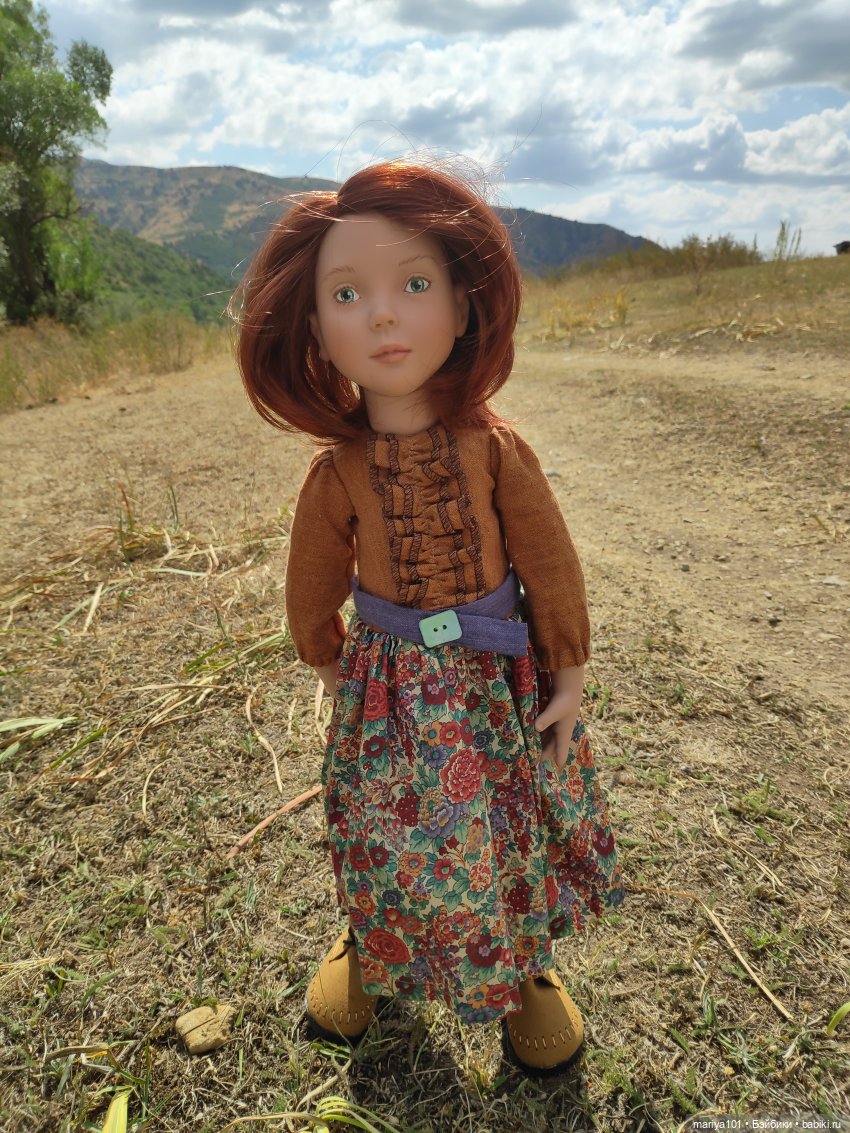 Вернусь к Марианне и поделюсь впечатлением. Потрясающее красивое лицо, правильно написано в описании, что куклы Zwegrnase очаруют вас своим любопытным, взволнованным или грустным взглядом. Очень выразительные глаза ( в описании они серые, у меня другие). Достойный парик, жесткие волосы, красивого оттенка.Тело забавное, особенно умиляют руки. Аутфит качественный (платье, жакет болеро, штанишки, на ногах у нее не колготки, а синие лосины и носочки.) Яркие, красные ботинки изготовлены из натуральной кожи и реально велики по размеру, но это такая задумка, стиль!