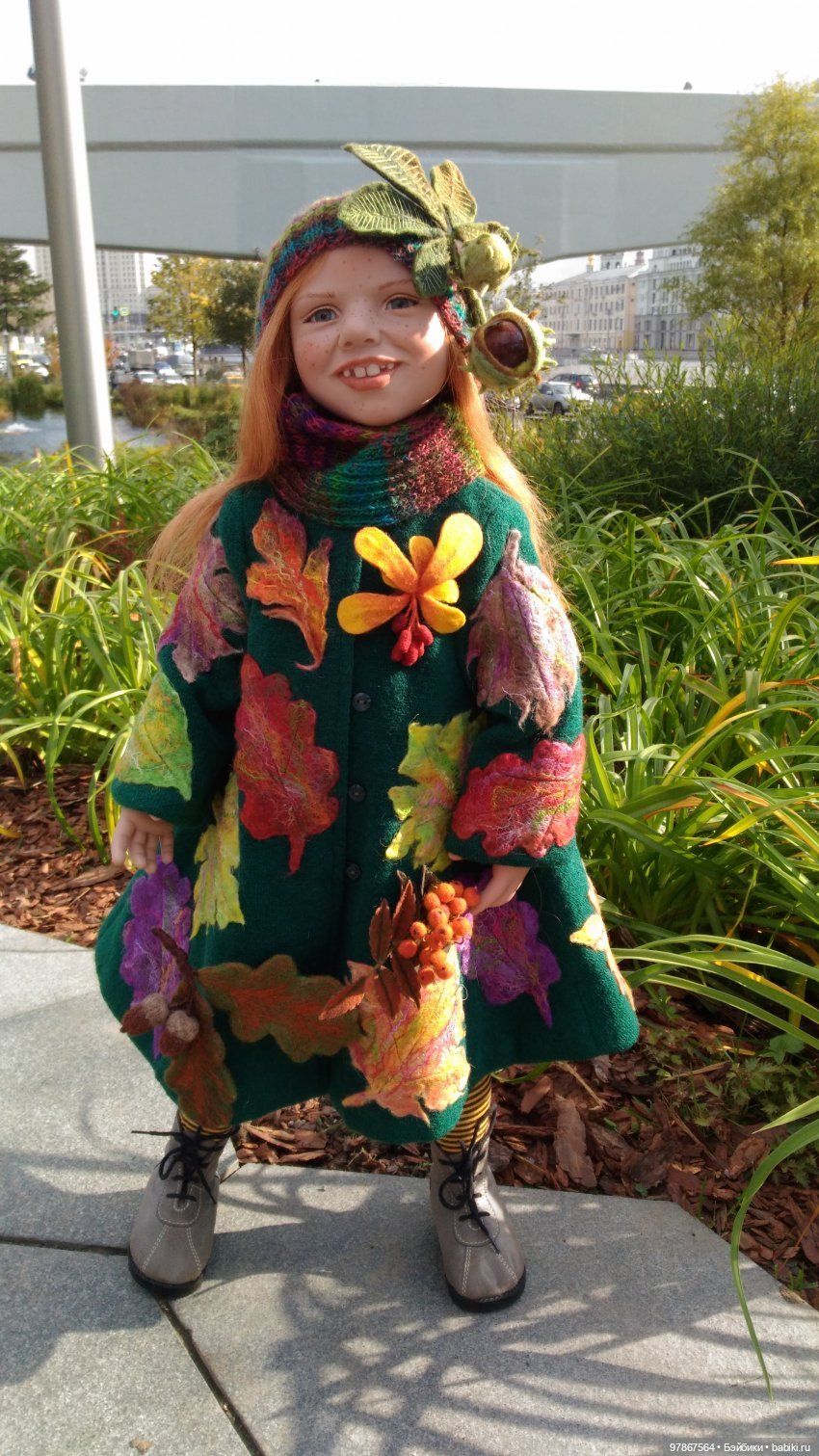 Уже совсем осенняя девочка фройляйн Октябрь. В шерстяном костюме (эх, выпало из головы название ткани с таким рисунком), вязаном теплом свитере. С листиком клена, багровым, и брошкой-сеттером, охотничьей собакой. И правда, время охоты или лучше просто долгих лесных прогулок. Рыжая, как осень.