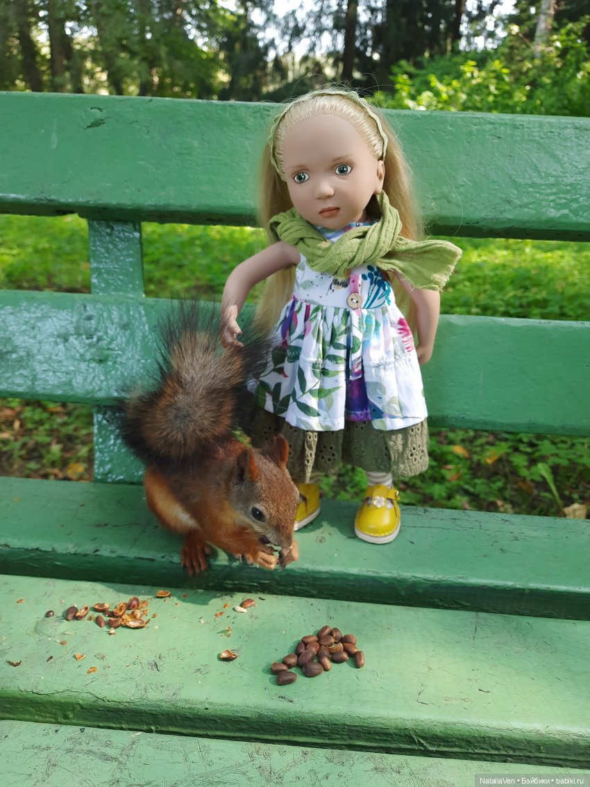 Поснимаю на память, пока она от меня не уехала, подумала я. Заодно и куколка развеется. И мы пошли гулять. Не смотря на конец декабря было очень тепло, будто по весеннему припекало солнышко, ярко освещая верхушки гор. В воздухе летало еще волшебство Рождества, позванивая, почти не слышно, серебряными колокольчиками. Малышка без имени все не поднимала головы, а смотрела куда-то вниз, в траву. Я вдруг последовала ее взгляду… и увидела олений рог, красивый и блестящий. И будто увидела мысленно молодого оленя, сражающегося с более крупным противником… и услышала внутри себя «вот видишь, как интересно, если иногда смотреть себе под ноги и никуда не спешить!». Хм, игра воображения, подумала я и мы зашагали дальше. Малышка теперь приподняла голову и смотрела вперед. Мы шли шли, уже поднялись довольно высоко на гору, когда я заметила, что одного бантика не хватает, красного, самого красивого. Растроенная, я сказала мужу, что надо вернуться и поискать его. Мы пошли обратно, глядя под ноги. Вот и бантик! И тут совсем рядом мы услышали странные звуки, повернули голову чуть вправо и увидели лису, красивую, с густой рыжей шерстью. Но она лежала в траве и глубоко дышала, тоскливо поскуливая. Неподалеку от нас, тропою ниже шла пожилая женщина и мы сразу позвали ее. Женщина поднялась на нашу тропу и стала звонить в спец службу по помощи животным (хорошо, что она знала нужный номер), мы немного поговорили и она сказала, что останется ждать помощи, а мы можем дальше идти гулять, нам нет нужды оставаться. Она на пенсии и никуда не торопится ))). Мы пошли дальше и тут я посмотрела на безымянную куколку… это ты специально тут бантик обранила, чтобы мы вернулись и помогли лисичке? Угу, кивнула она. Так мы и шли дальше молча, каждый думал о своем. А утром, когда я подошла к стеллажу, то вдруг увидела безымянную куколку… но вместо реденького светлого каре на голове у нее красовалась рыжая копна густых волос. Подарок от лисички, мысленно сказала мне Лисси и хитро подмигнула. Вот такая вот не выдуманная история )) И весной мы тоже ходили гулять… когда просыпалась жизнь и планета начинала жужжать и копошиться, и покрываться разноцветными веснушками весенних цветов… и летом, бродили мы по желтым полям одуванчиков, когда жизнь бьет ключем и переполняет энергией… и осенью… за грибами… Лисси особенно любит собирать рыжие лисички. Казалось, идет она по осеннему лесу… а из под шлейфа ее рыжих волос вырастают лисички, такие же яркие, только и успевай собирать. Но это, конечно же, игра воображения ))