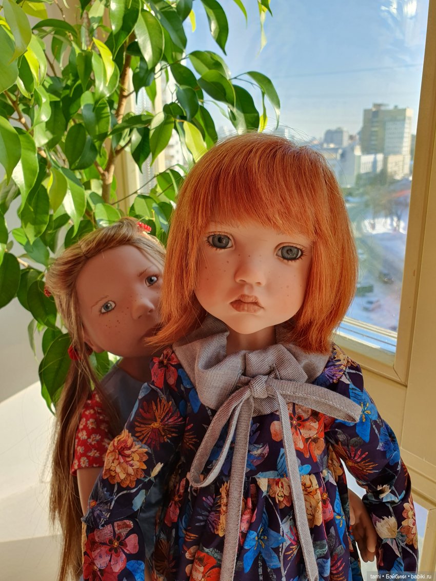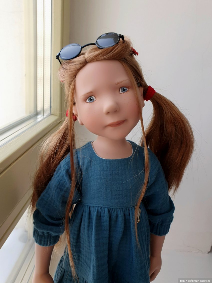 Юбилейная лимиточка. Лимит 25. Густые русые волосы, глубокие голубые глаза и расписанное вручную привлекательное личико с закушенной губкой. На кукле летнее платье в голубых тонах, леггинсы, модные эспадрильи красного цвета. Завершают образ плетёная сумка и солнечные очки. Очень нежная, мечтательная малышка. Что интересно- на фото в шопике она мне казалась обиженной, расстроенной чем-то… эта ее закушенная губка… А из коробки выбрался ребенок с полуулыбкой, довольный жизнью, даже с какой-то хитринкой. Как так??? Видимо, это и есть волшебство кукол от мастера Nicole Marschollek-Menzner. Они такие разные при повороте головы, при смене освещения, при разном расстоянии до куколки от тебя… Мне еще это все в новинку.