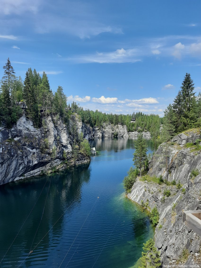Это затопленный мраморный карьер с ледяной водой, глубокий — до 50 метров общая глубина. Купаться, конечно, нельзя, по нему ходит понтон и, иногда, лодки, по верху протянут канат-троллей, но на рискованные аттракционы Мьёлль благоразумно не смотрела.