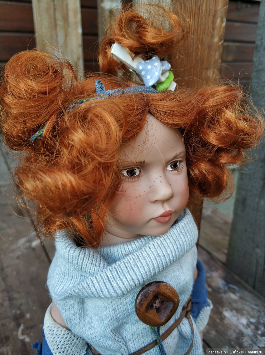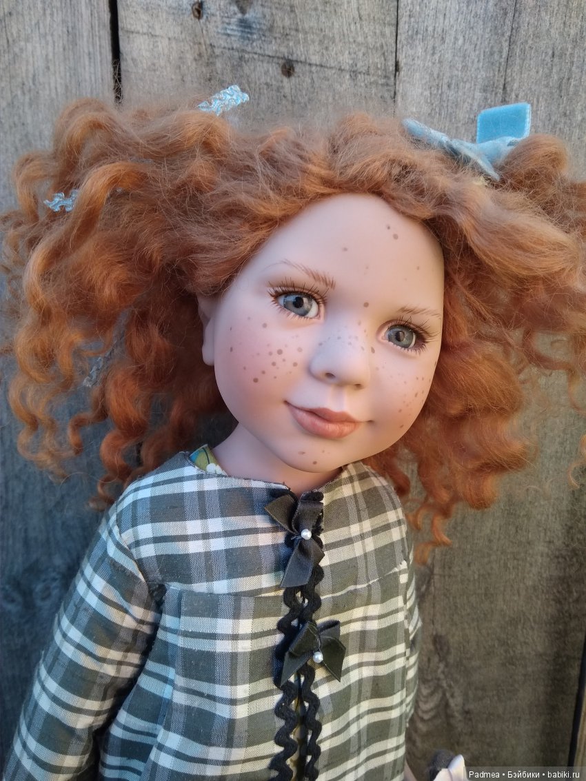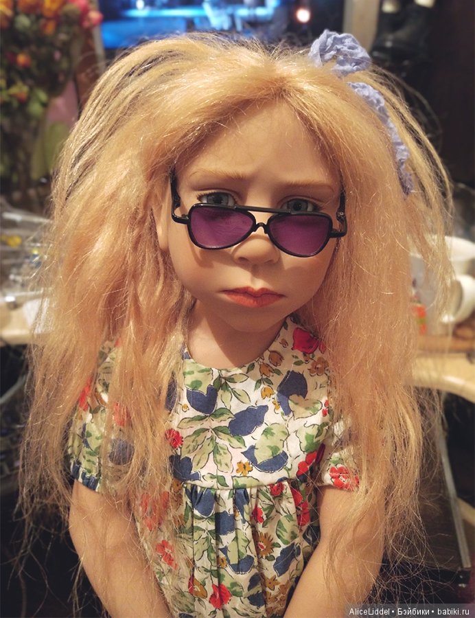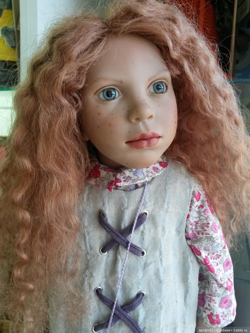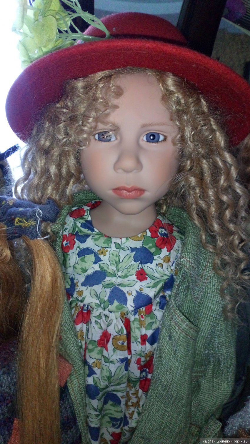После первого знакомства, когда шок немного прошел, пришла к мысли что несмотря на коллекционность и всё такое, надо что-то делать с волосами, за 11 лет жизни девчонки, не смотря на то что она жила в заботливых аккуратных и любящих руках, прическа с кудрями несколько подсвалялась и ни расчесать, ничего, а мне надо все тискать и трогать… Так что мы помыли голову, к сожалению кудри пропали, но после половины бутылки бальзама, волосы стали приятными на ощупь и блестящими, а кудри, что кудри?) Как появится настроение, буду учиться пользоваться папильотками :)