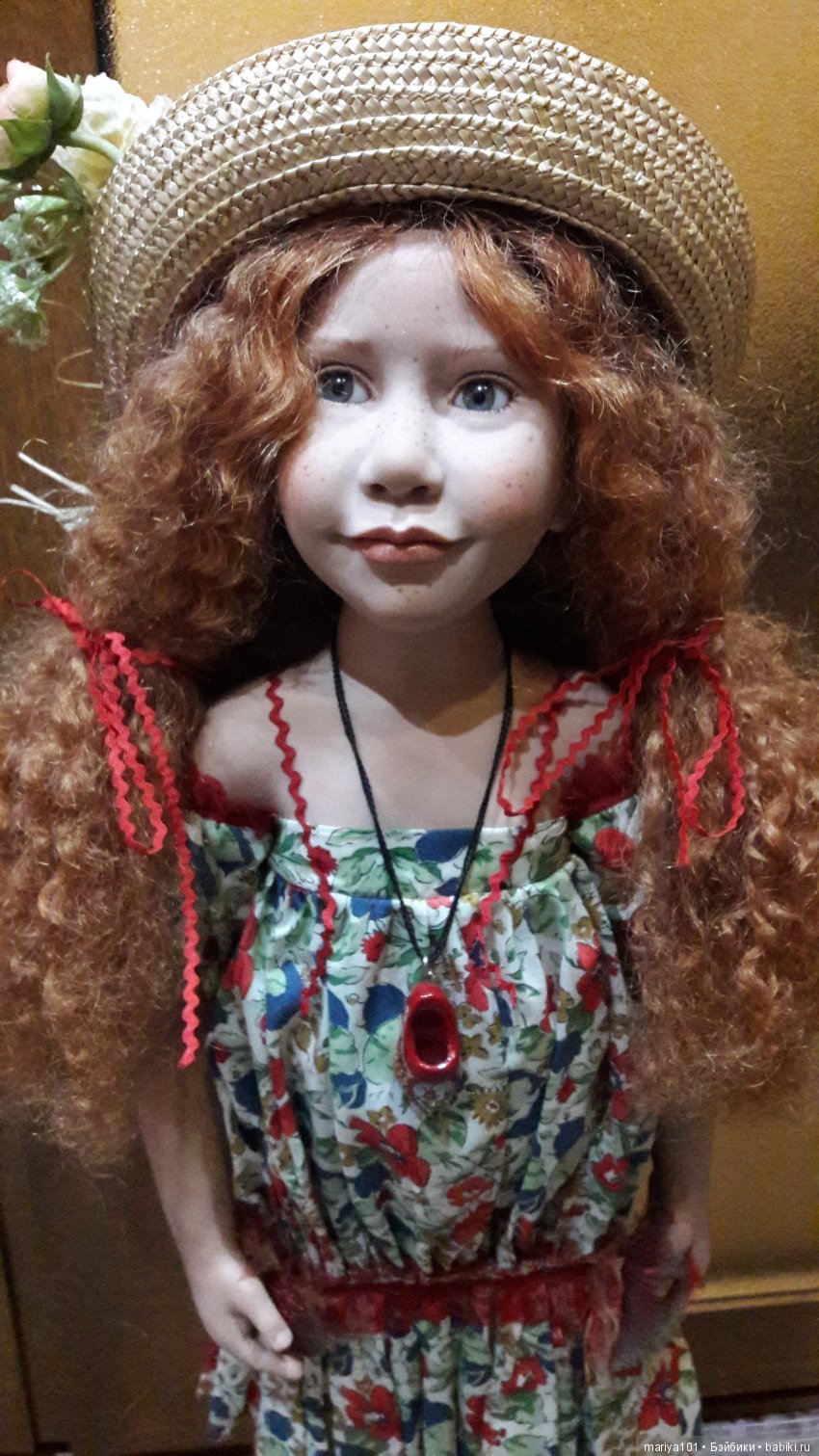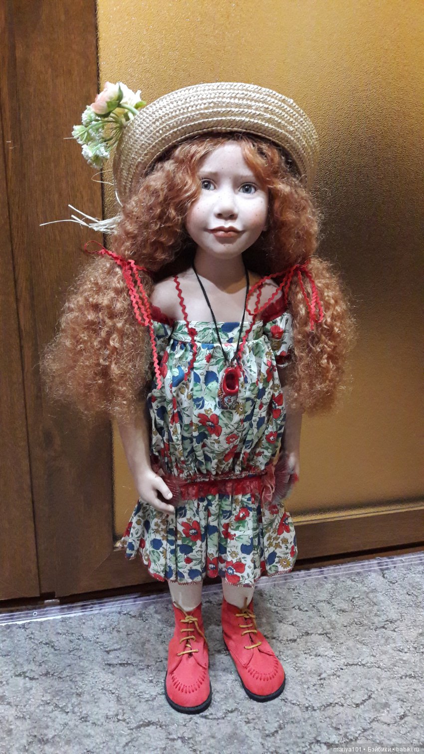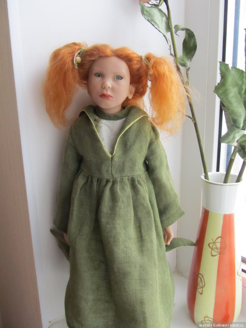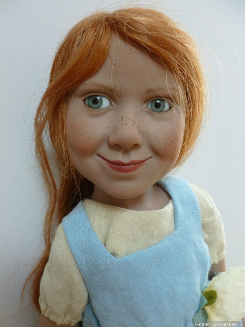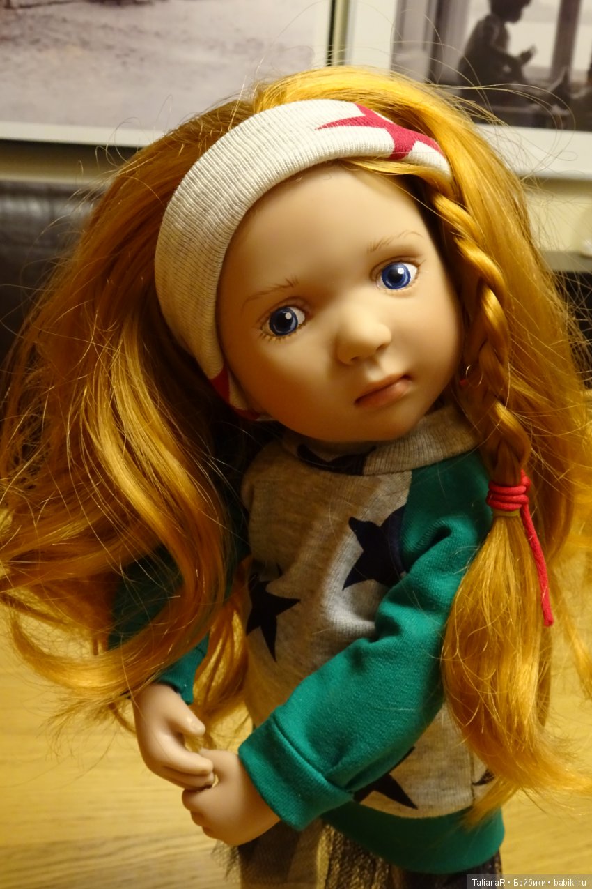 После первого знакомства, когда шок немного прошел, пришла к мысли что несмотря на коллекционность и всё такое, надо что-то делать с волосами, за 11 лет жизни девчонки, не смотря на то что она жила в заботливых аккуратных и любящих руках, прическа с кудрями несколько подсвалялась и ни расчесать, ничего, а мне надо все тискать и трогать… Так что мы помыли голову, к сожалению кудри пропали, но после половины бутылки бальзама, волосы стали приятными на ощупь и блестящими, а кудри, что кудри?) Как появится настроение, буду учиться пользоваться папильотками :)
