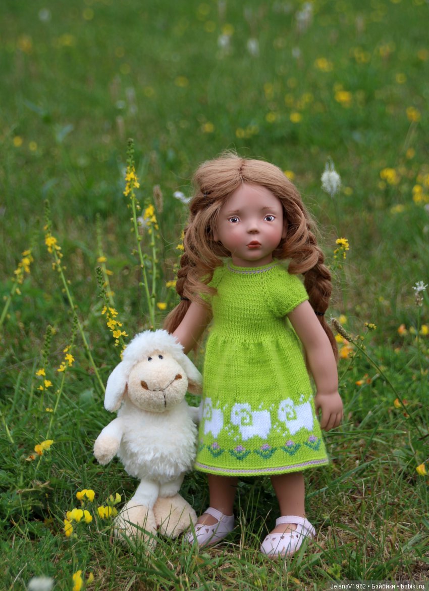 Клархен в платье с овечками взяла в руки овечку. Они чудесно смотрятся вместе.