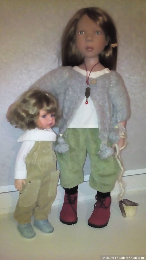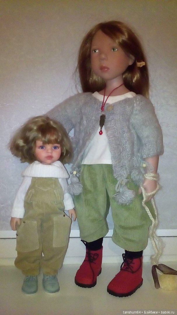 Когда у меня поселилась игровая кукла zwergnase, компанию ей составила моя любимица Василиса, и, собственно, теперь у меня любимицы две. Наряд Солечки(Сольвейг), я немного «одомашнила», надела на неё кофточку молочного цвета и уютный вязаный жилетик. А Василиса как-то не гармонировала своей одёжкой с новой подружкой.Но есть же замечательные мастера на нашем сайте! Екатерина- pyllada, нам с девочками и помогла воплотить идею. Теперь обе девчонки смотрятся, как сестрички: старшая и младшая. Фото скромные, очень хочется показаться нам уже. Но это первые фото, будут обязательно ещё и качество будет выше и лучше!