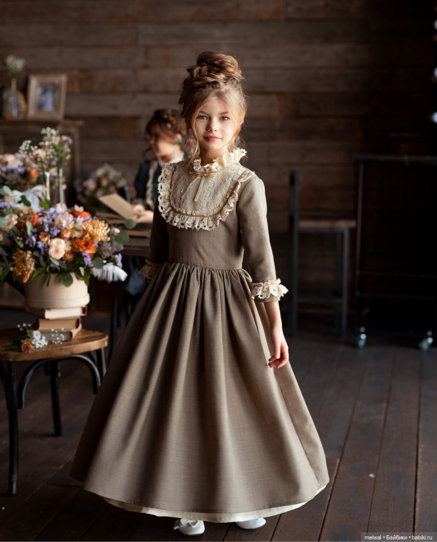 Светлое лучше будет не пышное с воланами, а более строгое, с воротником-стойкой, защипами и узкими рюшами, в стиле «тургеневская девушка».