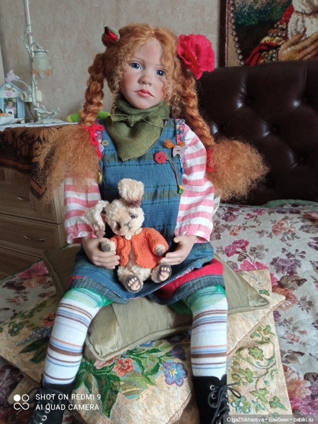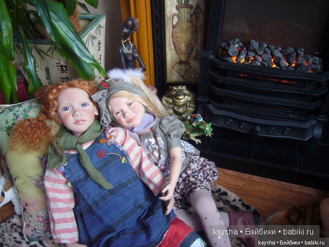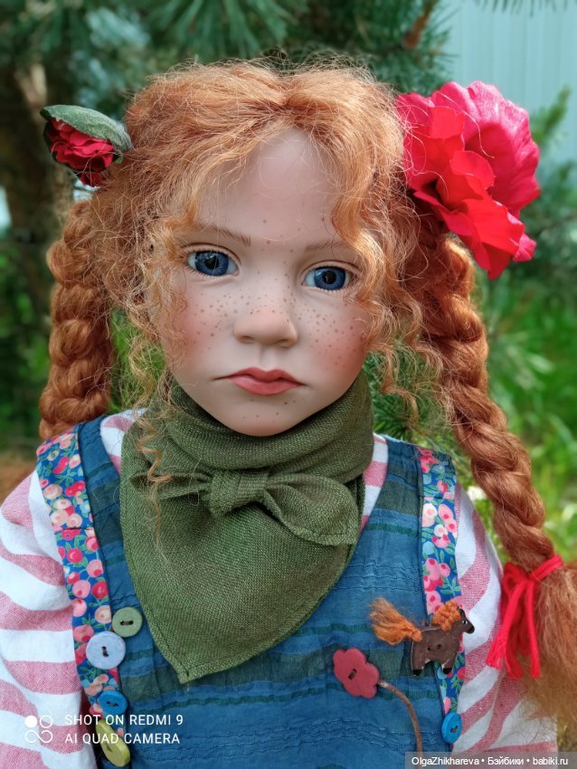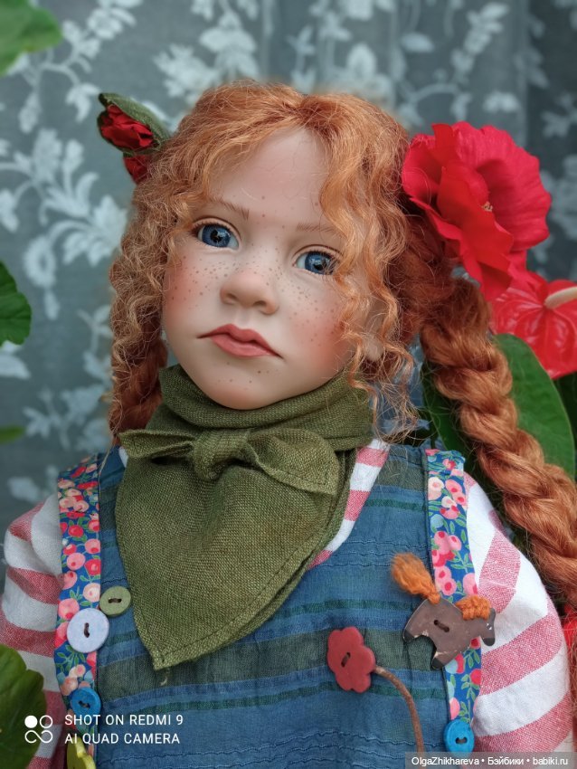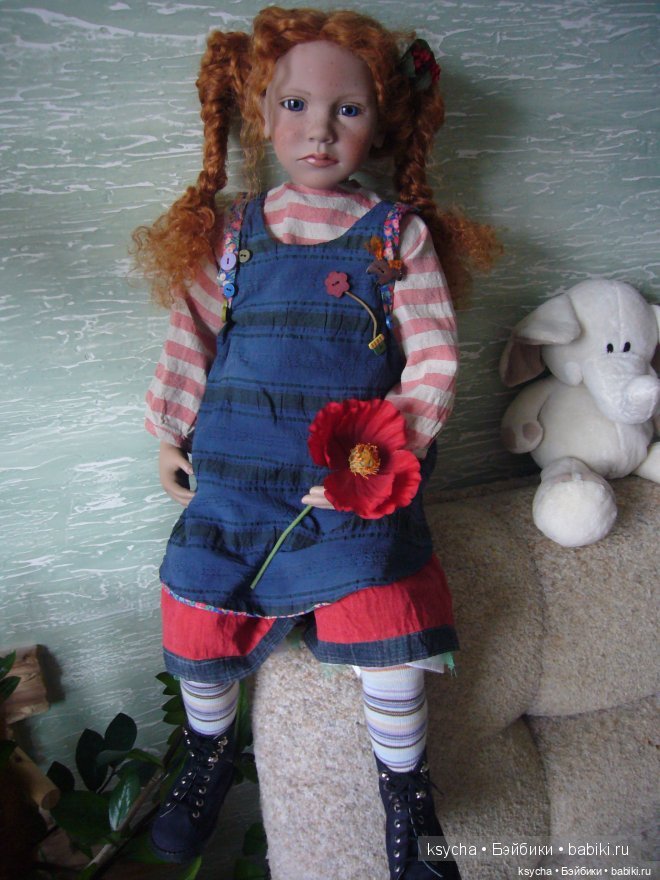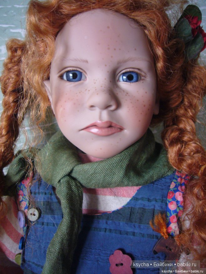 Рост этой синеглазой и рыжеволосой красавицы 85см. Девочка задумана сидящей, но может и стоять в стенде. Она уже познакомилась со своей кузиной-одномолдницей Ённой (Jonna) коллекции 1998 года с ее собачкой Kiki.