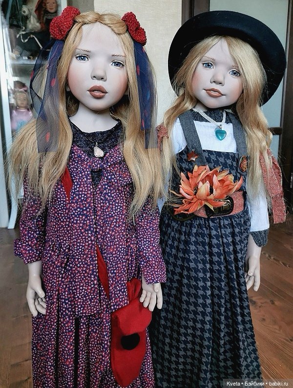 Куклы прекрасны, но у них есть небольшой недостаток — они довольно много весят и высокие, так что долго с ними обеими не прогуляешь. С одной-то еще ничего, а вот с двумя сложно — тем более что я сама ростом 160 см. И их трудно установить на ногах, они так и норовят завалиться то вперед, то назад, даже если опираются спиной на что-нибудь.