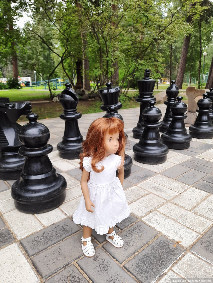 Такая история приключилась… В июне 2023 года собрались мы сфотографировать Малу в шахматном платье. Нашла в интернете, что есть фигурки в парке и поехали!