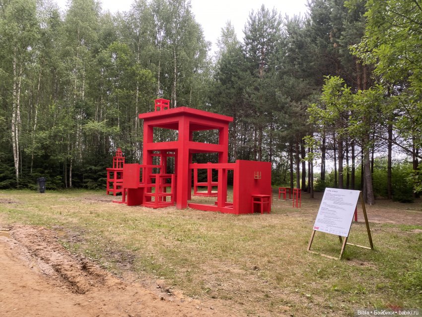 Но мы так глубоко зашли в лес, что наткнулись на арт-объект " Встреча" из маршрута «Малевич в лесу». Нашли указатель и решили, что в следующий раз идем по этому маршруту!