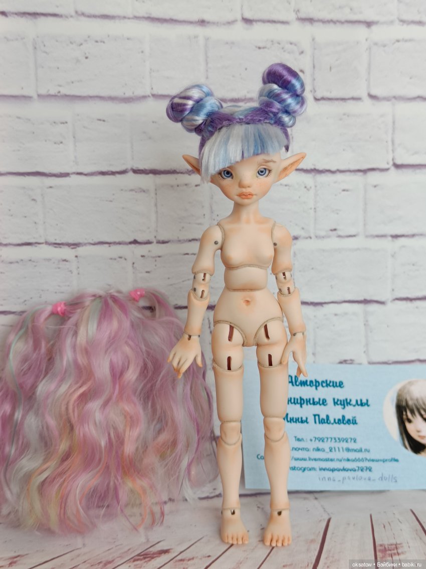 В комплекте кукла нюд, глаза (сине-голубые, на фото), два парика работы автора (фиолетовый с шишечками и сиренево-розовый волнистый), карточка-сертификат.