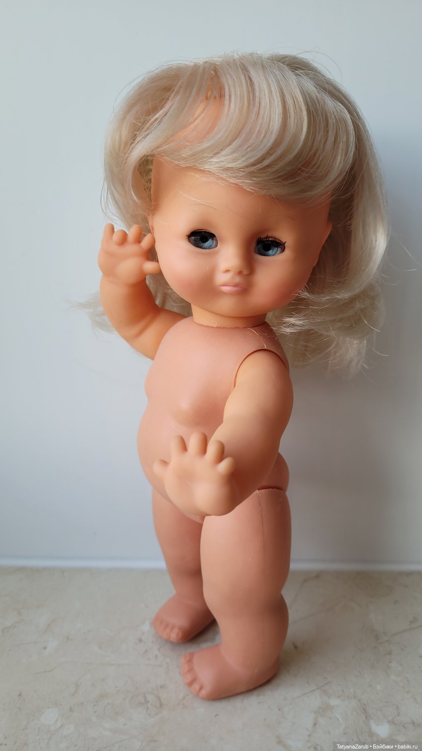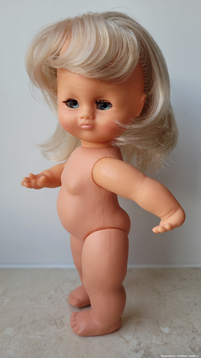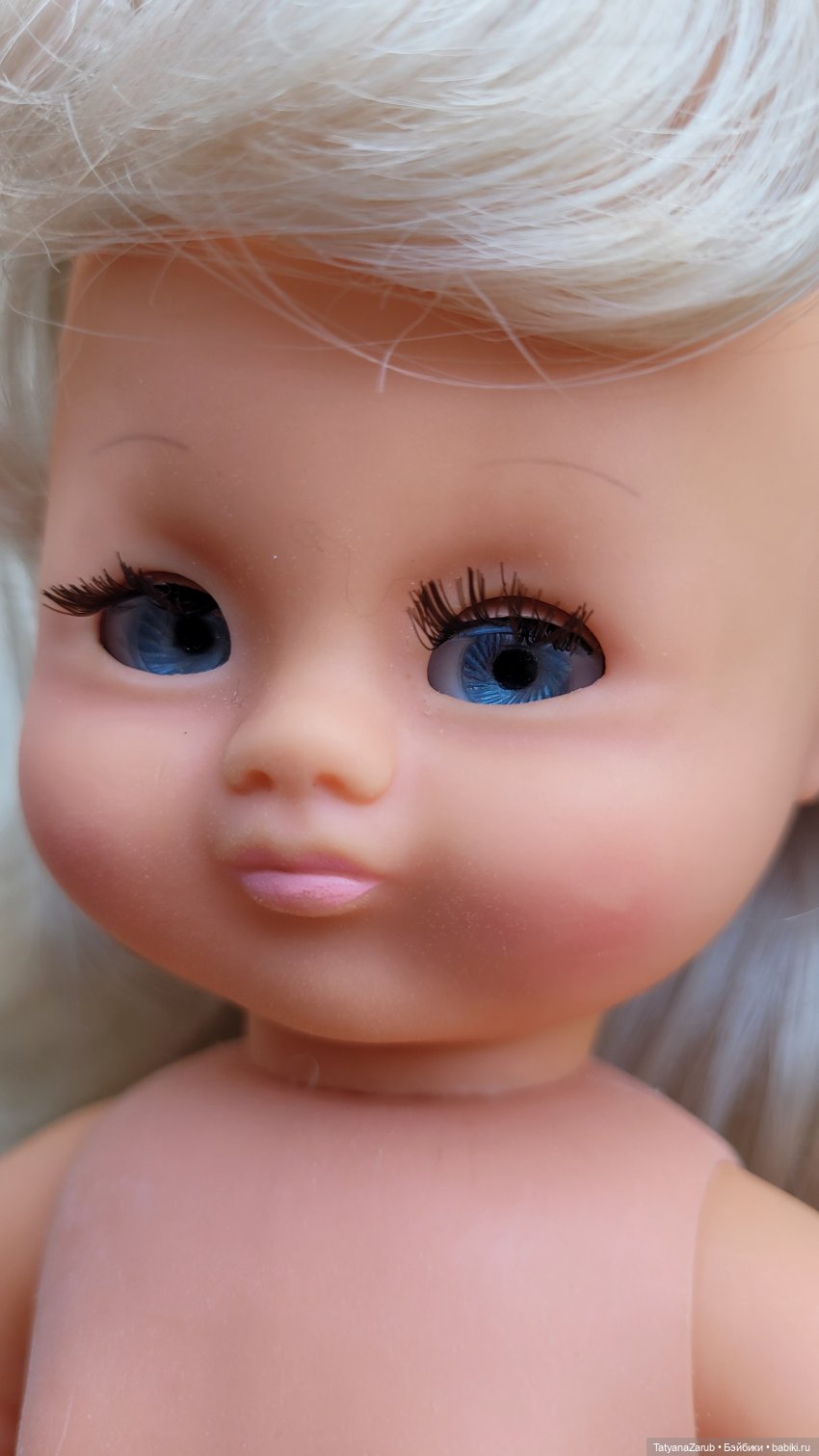Голова и руки выполнены из винила; ее тело и ноги выполнены из полифлекса.