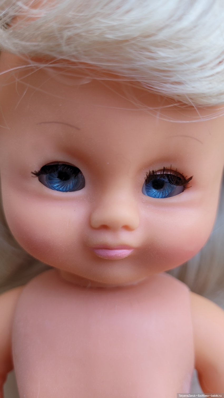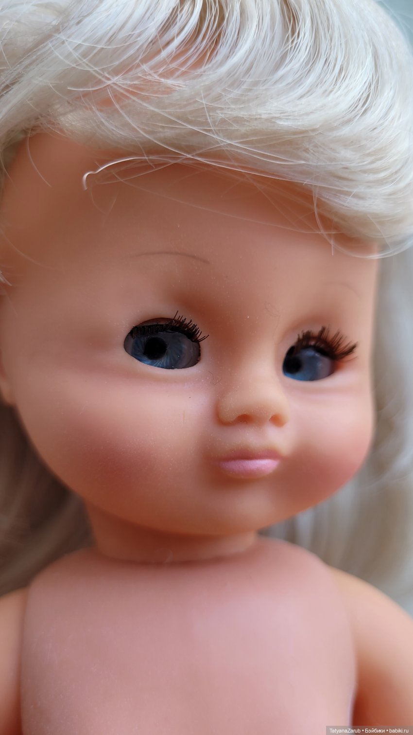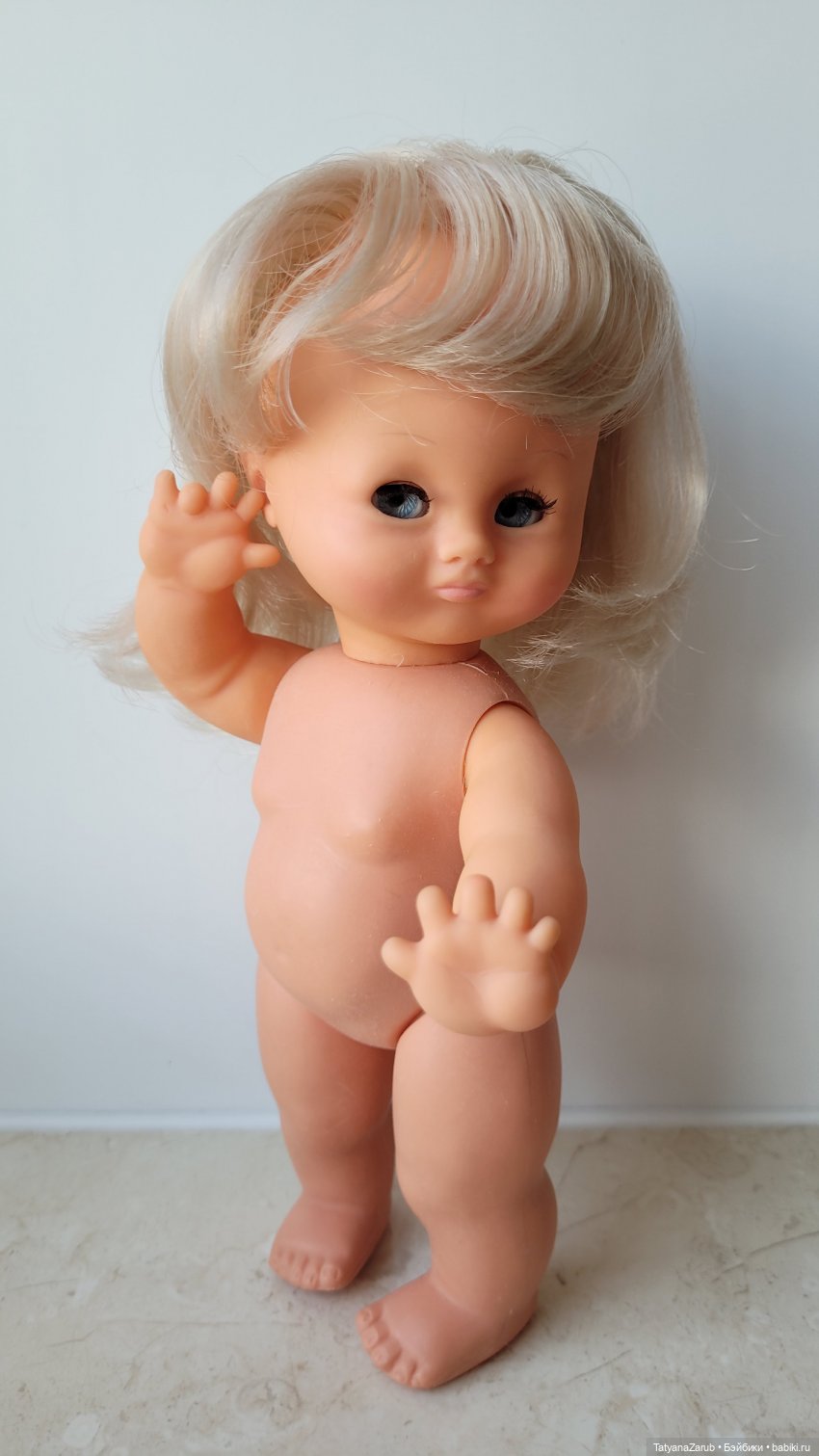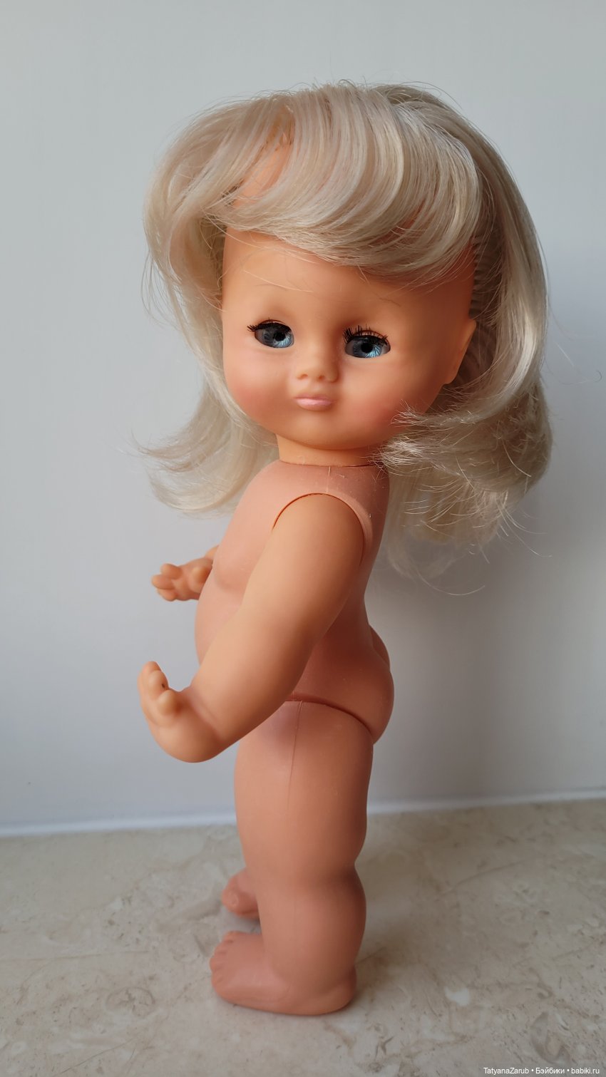 Голова и руки выполнены из винила; ее тело и ноги выполнены из полифлекса.