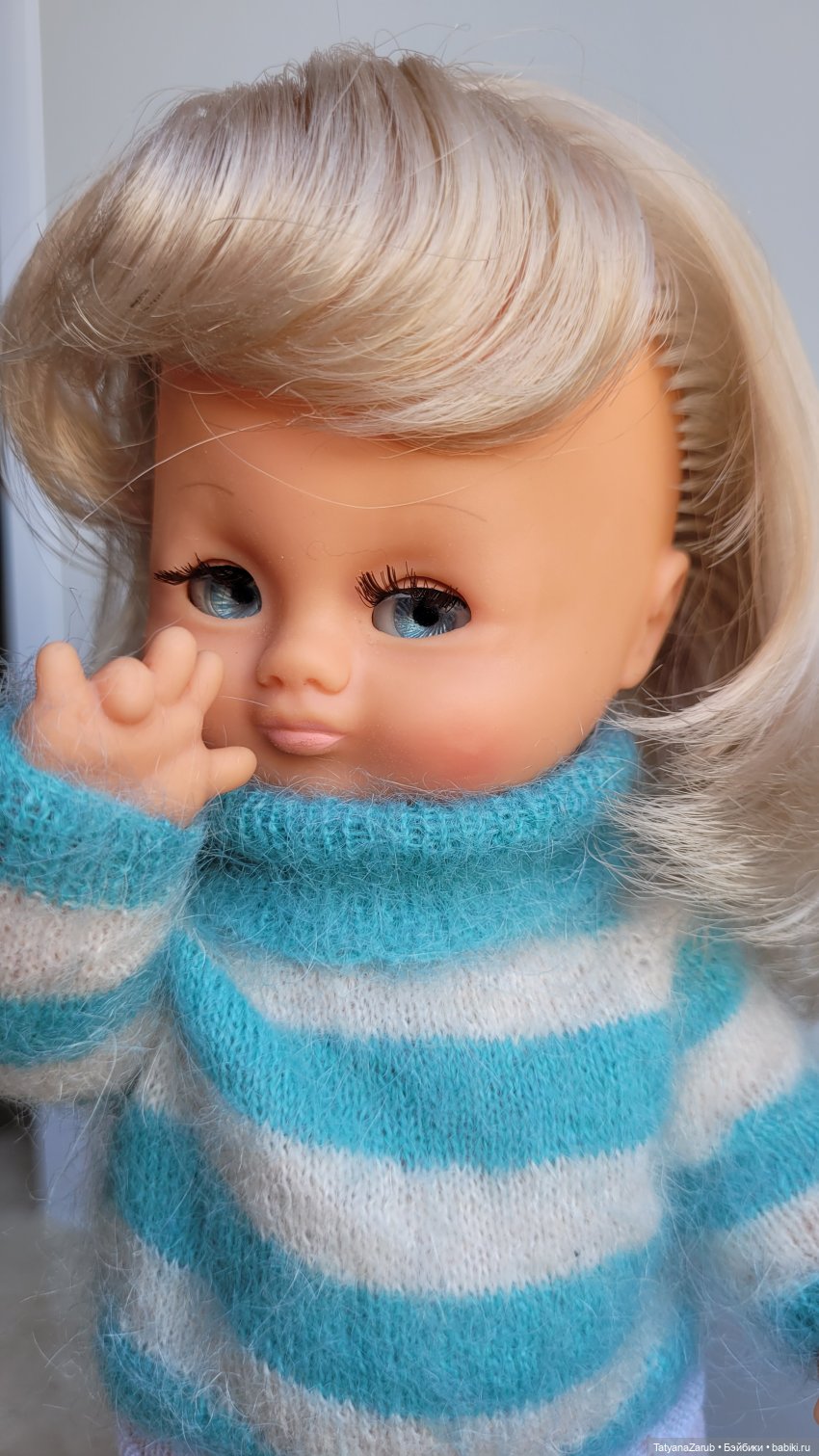 Следящие голубые глаза-coucou ресницы все на месте. Глазки заедают, закрываются по принуждению, как у всех clodrey этого периода. Клеймо на голове. Прекрасное состояние. Свитер связан специально для куколки из тончайщего мохера.