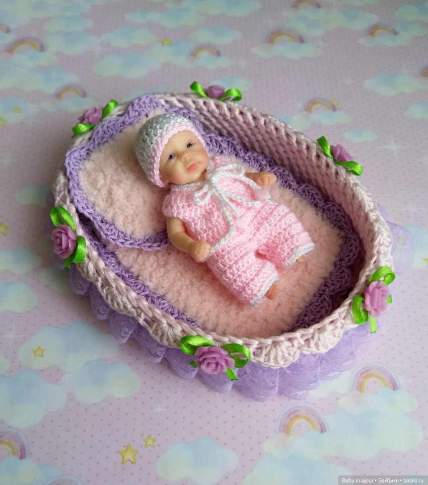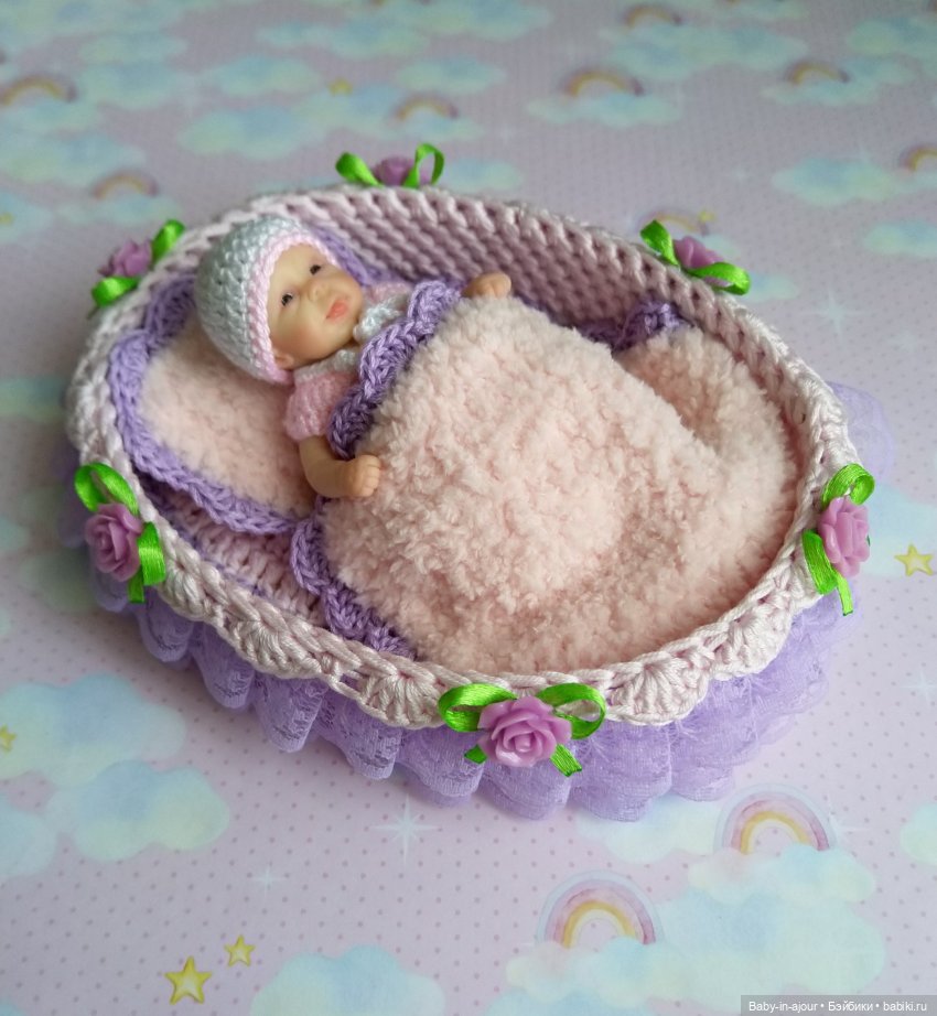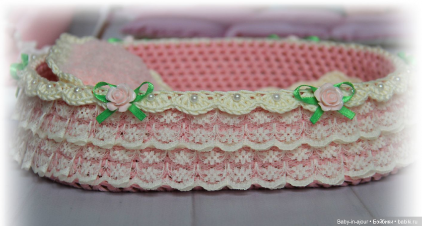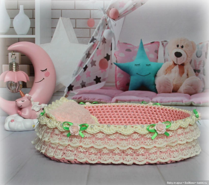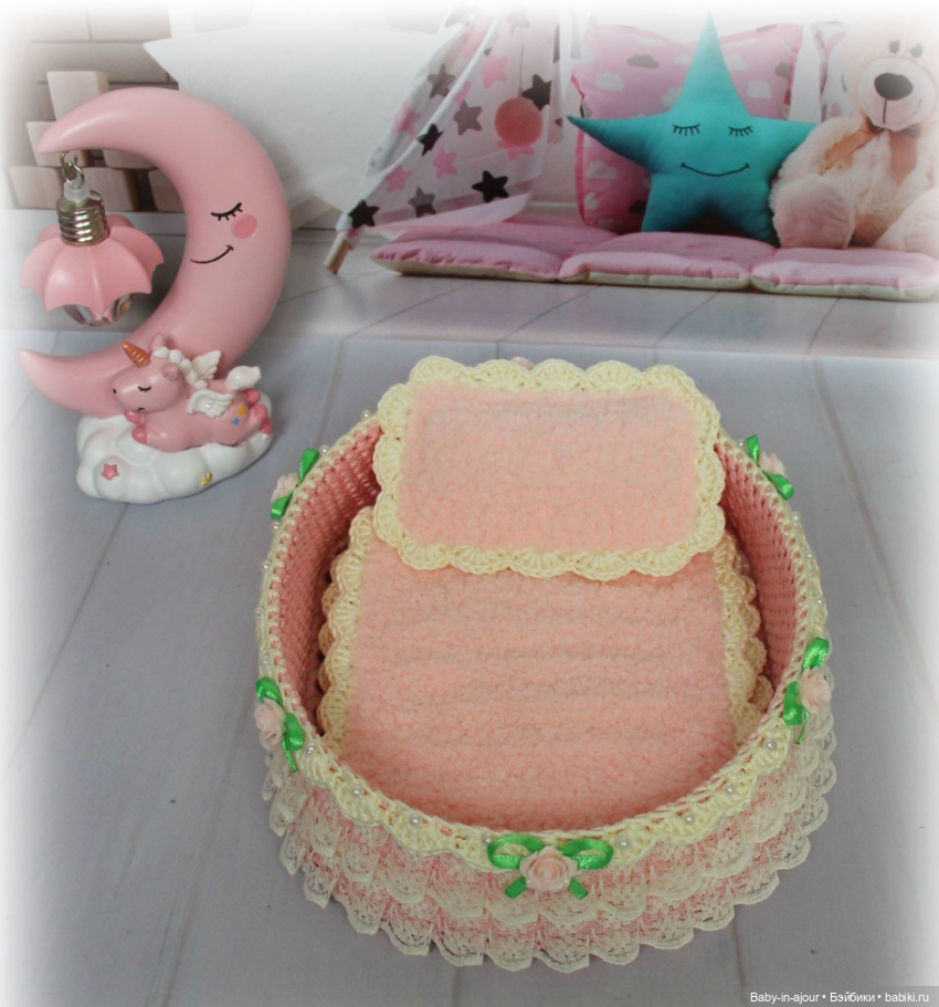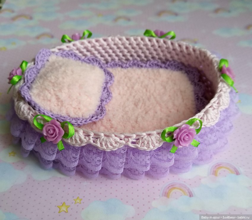 Дно у кроватки деревянное, очень прочное, бортики жёсткие, в них ввязан каркас. Украшена кроватка лёгким кружевом, розочками, бусинами. Дополняют кроватку очень уютные одеяло и подушечка, они связаны из невероятно мягких плюшевых ниточек.