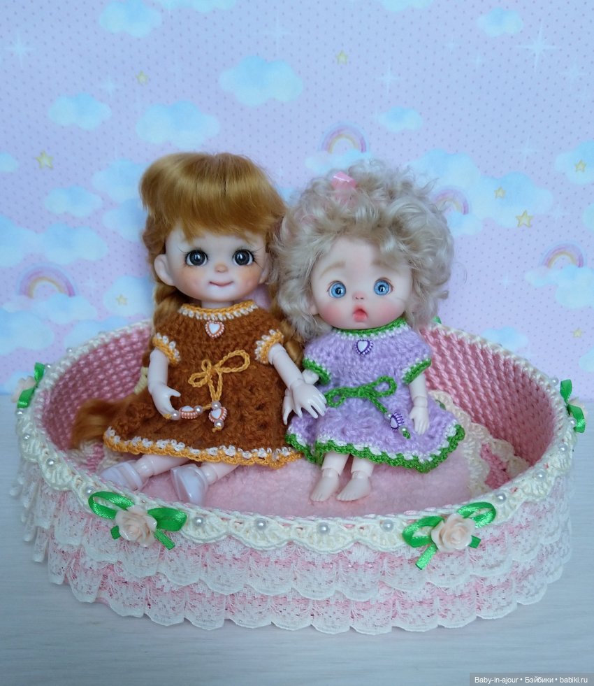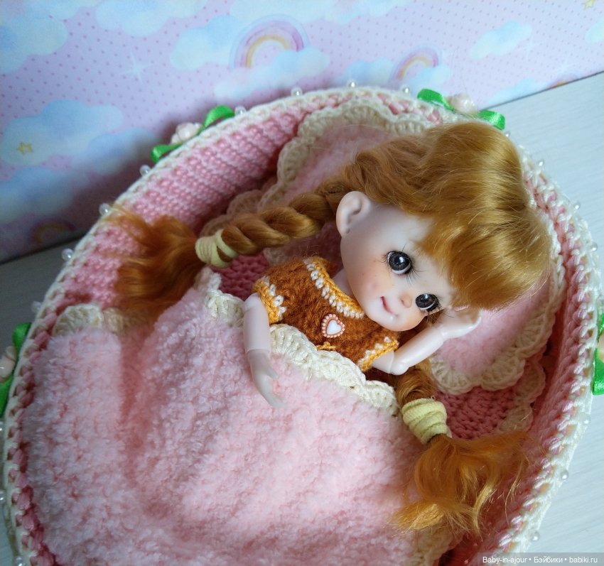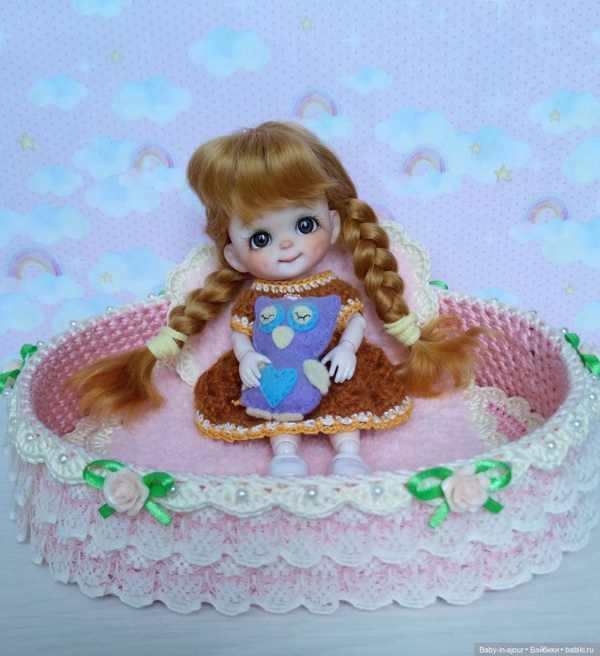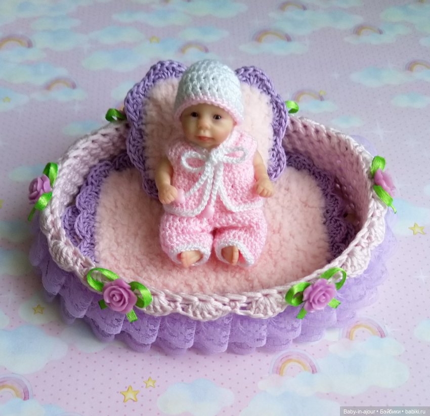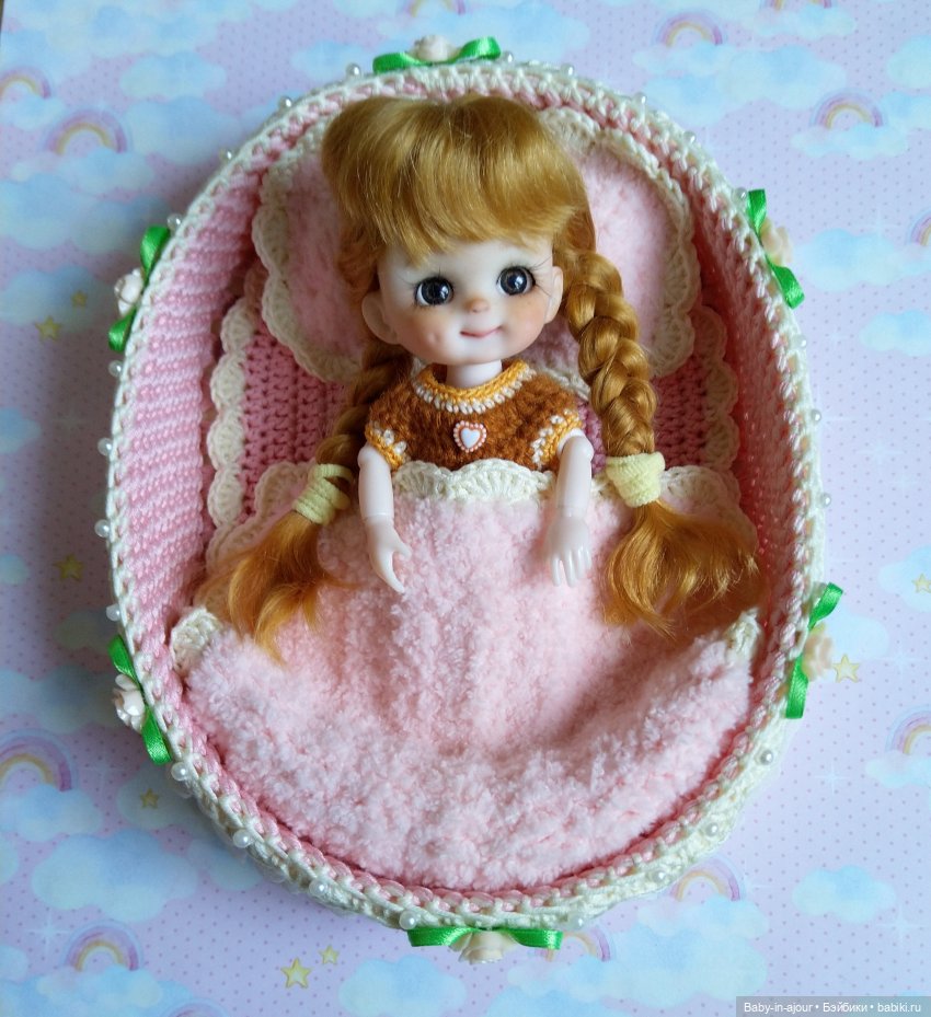 Дно у кроватки деревянное, очень прочное, бортики жёсткие, в них ввязан каркас. Украшена кроватка лёгким кружевом, розочками, бусинами. Дополняют кроватку очень уютные одеяло и подушечка, они связаны из невероятно мягких плюшевых ниточек.