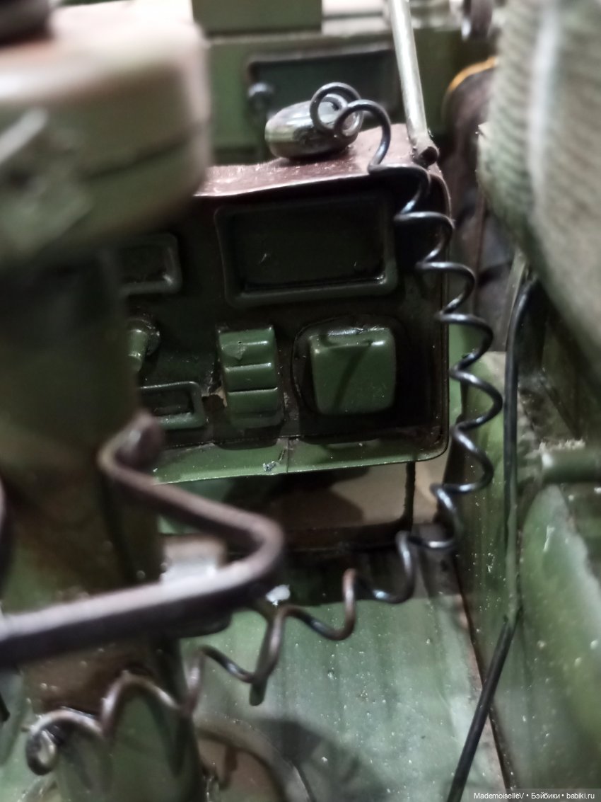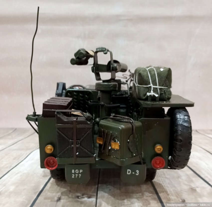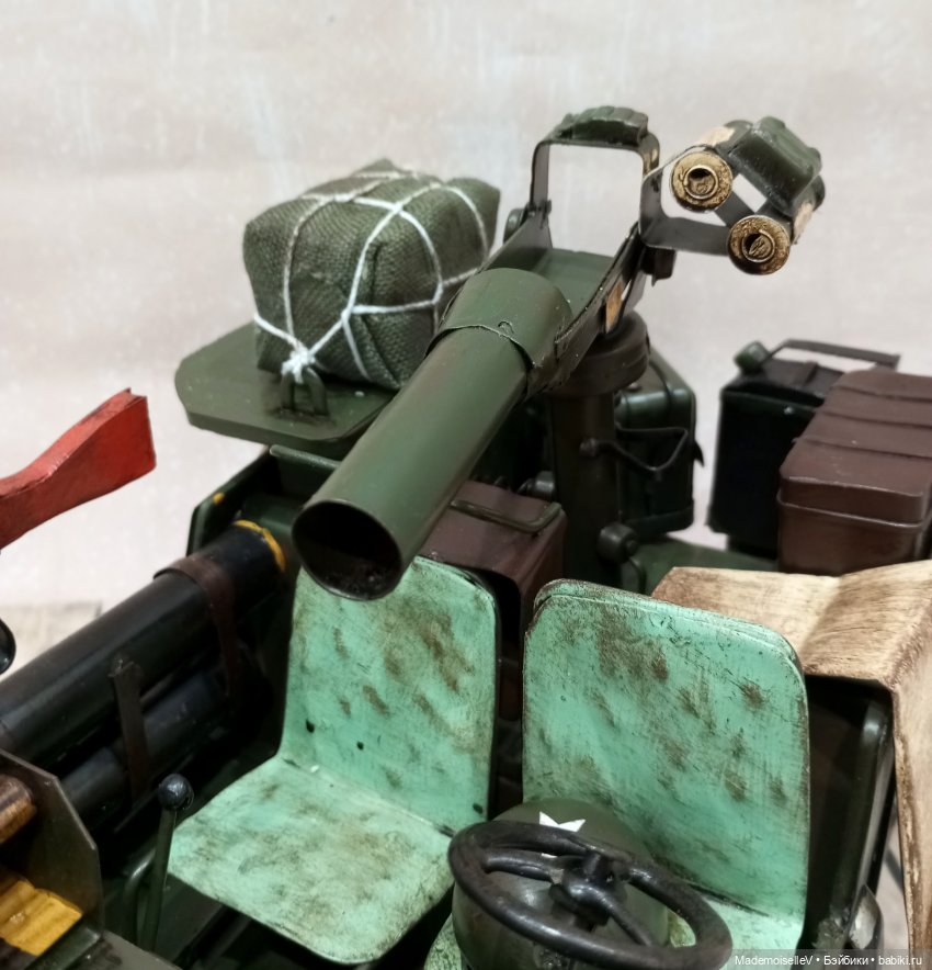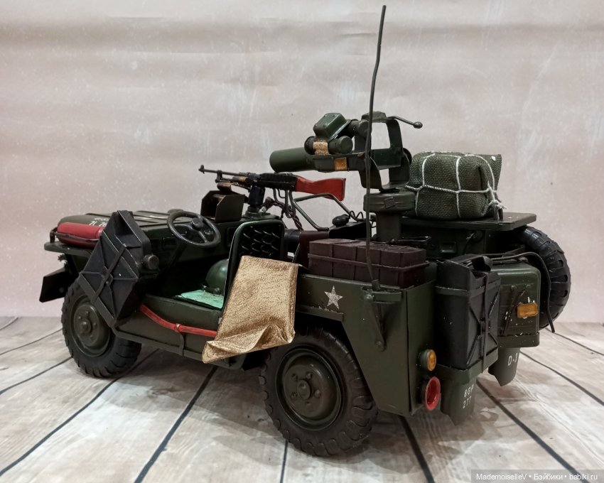 Ручная работа, Китай. Немного искусственно состарен. Почти всё из металла, два тканевых тюка. Колеса крутятся, руль поворачивается, но на колеса не влияет. Задняя пушка крутится. Все канистры, огнетушитель, каска, носилки и т.д. прикреплены к машине, не съемные. На переднем сидении каска прикреплена к сидению, мешает водителю сесть на место. Прикреплена вроде бы на клей, думаю, можно оторвать, но сидение под каской не покрашено.