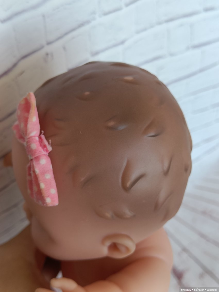 Рост пупса 21 см, не стоячий. Прекрасно сидит. Ручки-ножки поворачиваются без проблем. Винил плотный, приятный на ощупь, без усилия пальцами не продавливается, есть легкий аромат ванили. Пупс качественно сделан. Трещин, царапин, дырок на виниле нет. Глаза не закрываются. Бантик прошит сквозь винил. Одежда не сохранилась, к сожалению. Сразу отмечу — на голове подстерта краска на волосах в 5 местах.