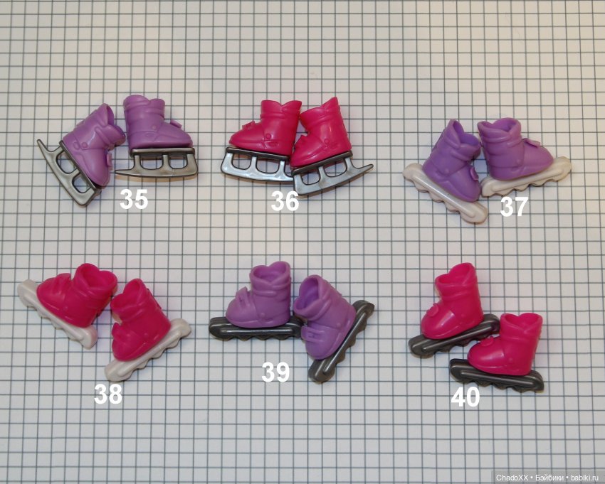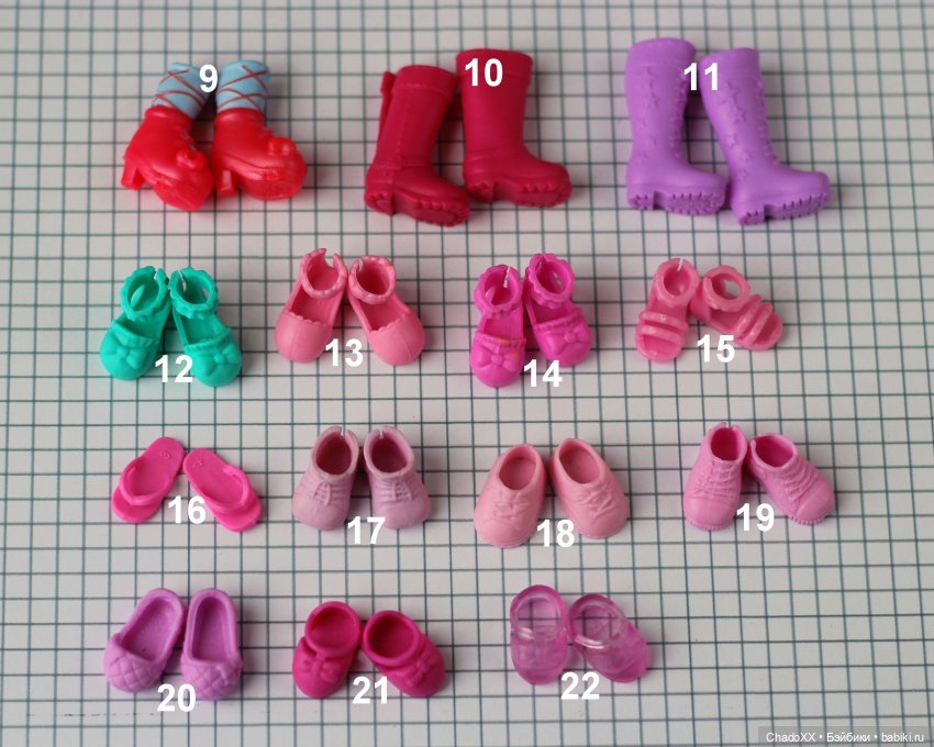 №№11-16 и №№19-20 — обувь с маркировкой Chelsea — на Челси Маттел. Также подойдут на Келли и мини аниматорс, но высокие модельки могут растопыриваться сзади (для улучшения посадки можно подрезать по высоте).