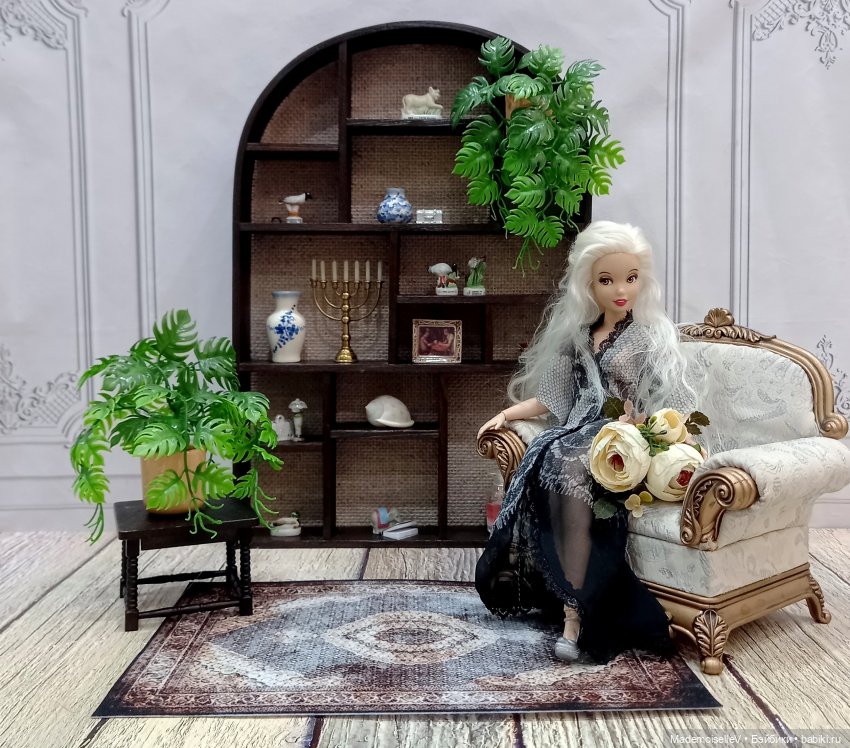 1) Настольная — ветви со всех сторон, «пушистая». Для формата 1/12 подойдет как напольная. Высота примерно 11 см, диаметр 10 см (фото №№ 3-10).