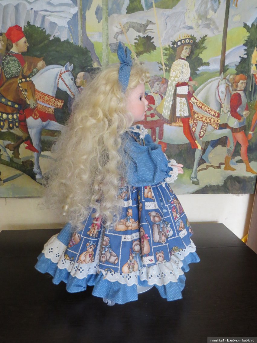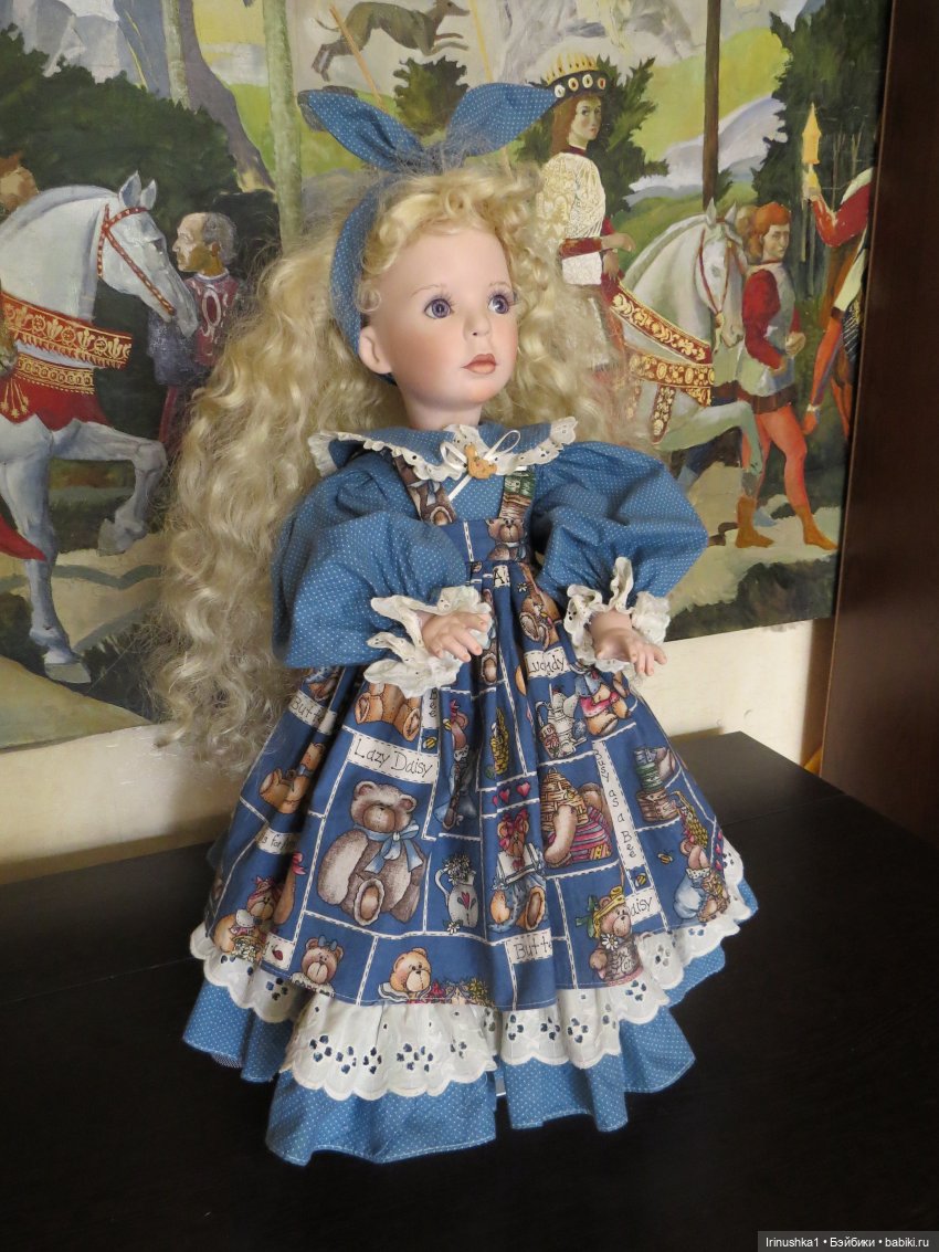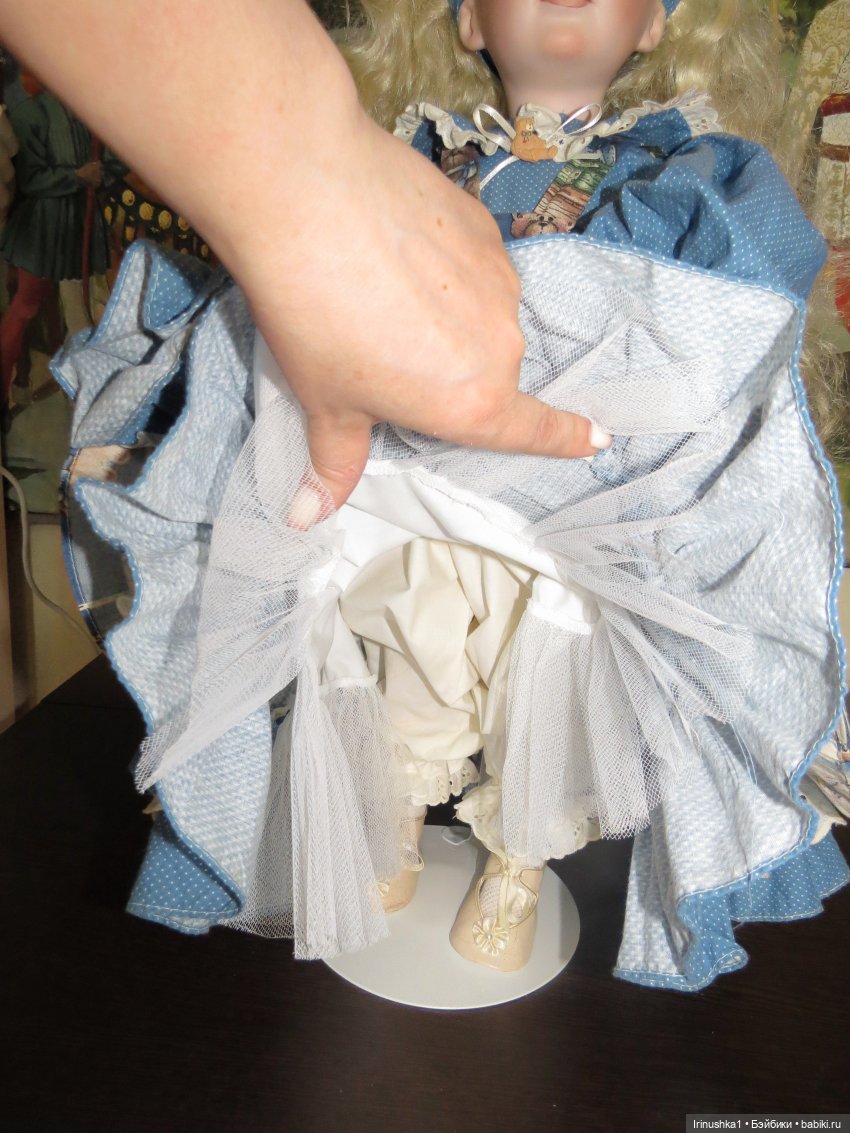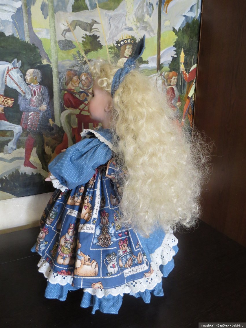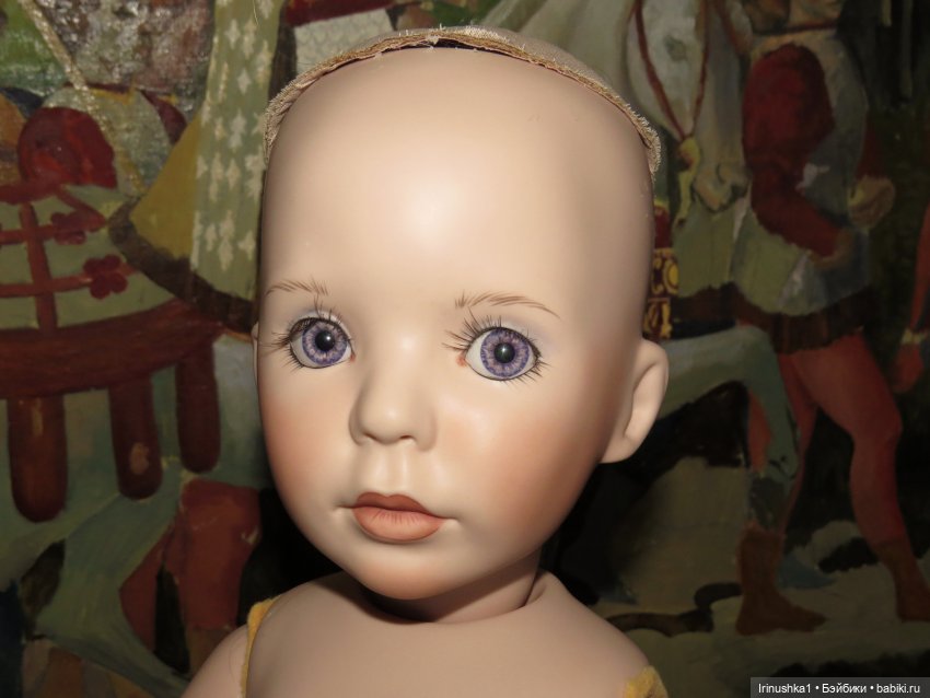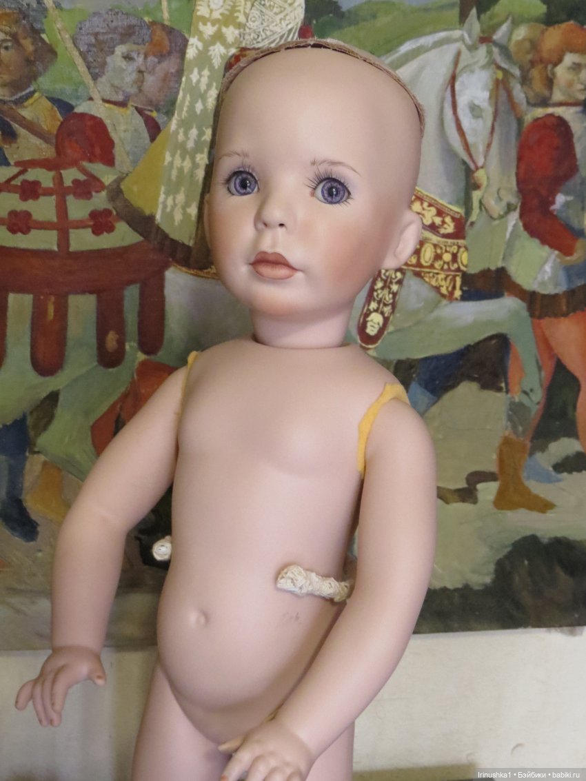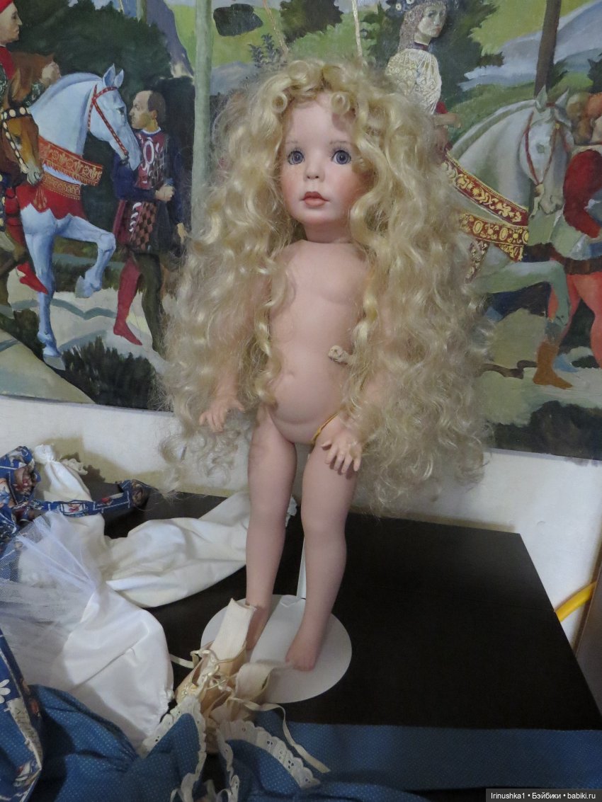 Представляю полностью фарфоровую куклу от совместной работы Линды Рик и Дианы Эффнер (Linda Rick и Dianna Effner). Удивительной красоты глаза. Надпись на пузике, к сожалению, подстерта за чем то прежним хозяином, но частично видна-кукла 1998 года. Этой кукле больше четверти века и у нее есть свои нюансы: на ножке есть след, как от стертой надписи, выставлю фото ниже. Туфельки заменены на новые. После снятия парика, на тряпичной шапочке есть пятнышко, под париком не видно совсем. Для такого возраста очень не плохо сохранилась. Документы и родная коробка не сохранились, такая она ко мне приехала. Одно время стояла в витрине под стеклом, потом была убрана. Подставка идет с куклой (что редкость). Стараюсь описать все нюансы как можно подробнее. Кукле 25 лет и вообще, это чудо, что она ко мне тогда целая приехала.) Все, кто работает с фарфором знает что это-ждать такую куклу из Америки. Упакую очень хорошо. Кукла тяжелая! В доме не курят и нет кошек-собак. Снята одежда, парик. Все постирано и поглажено. К своему удивлению обнаружила, что не только платье сзади на клею, но и бант на голове приклеен на клей, что по моему просто варварство.( Клей с парика пришлось вырезать. Парик густой и особого урона это не принесло). Приклеивать парик не стала, новая хозяйка сможет менять образ красавицы по своему усмотрению. Платье сзади просто сошью, при желании платья можно будет менять. Натяжка отличная, голова крепко сидит на плечах.) Головка полностью очищена от клея, на паричке по кругу есть остатки клея, на платье в районе воротничка и шва немного осталось. Добавлю подробные фото на перечисленные нюансы.