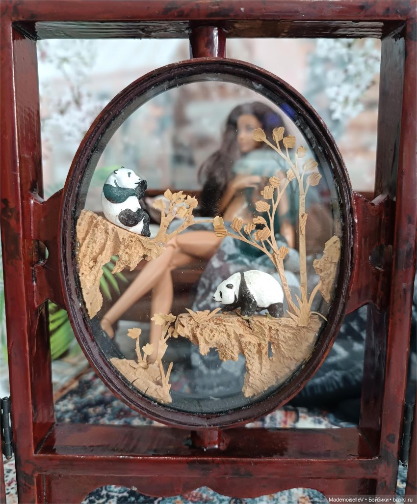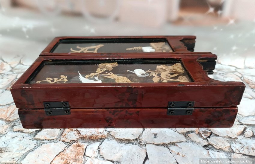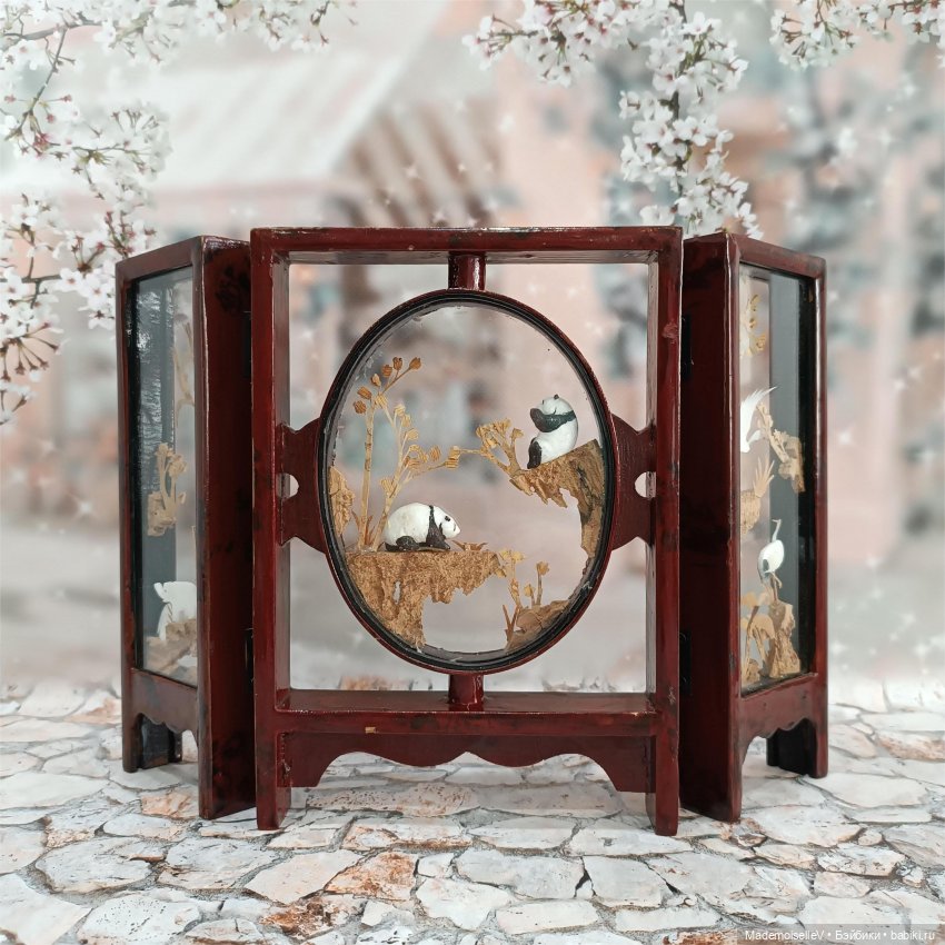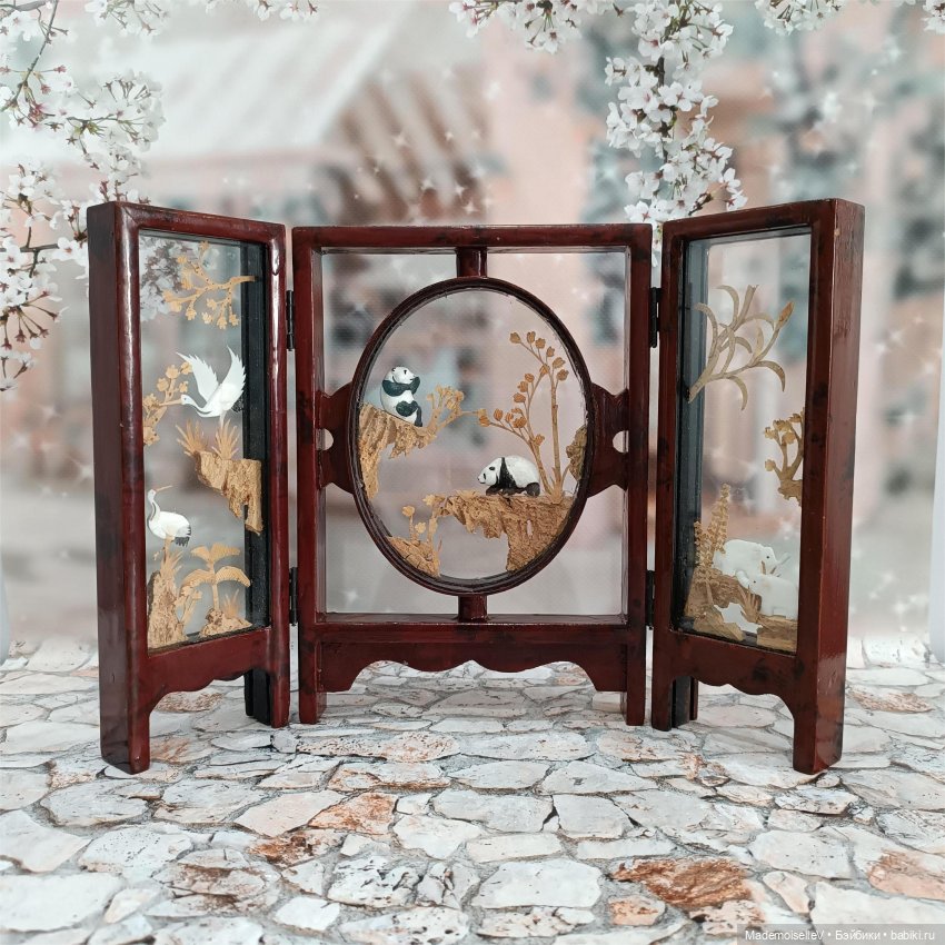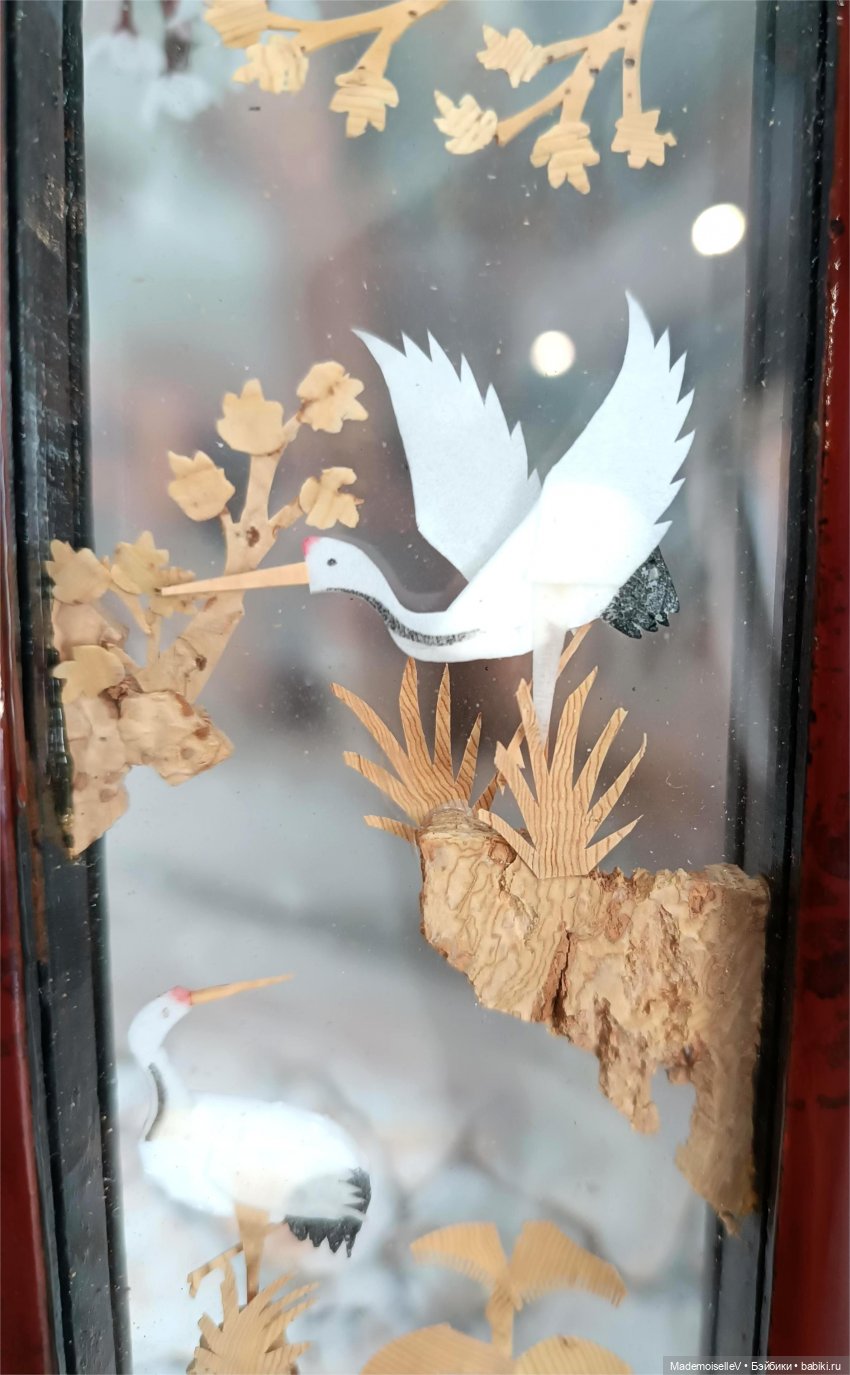 Вставки внутри створок объемные, выточены вручную из пробкового дерева. Объемные изображения с двух сторон закрыты стеклом. Благодаря этому достигнут интересный эффект «прозрачности». Традиционные китайские сюжеты — журавли, панды, природа.