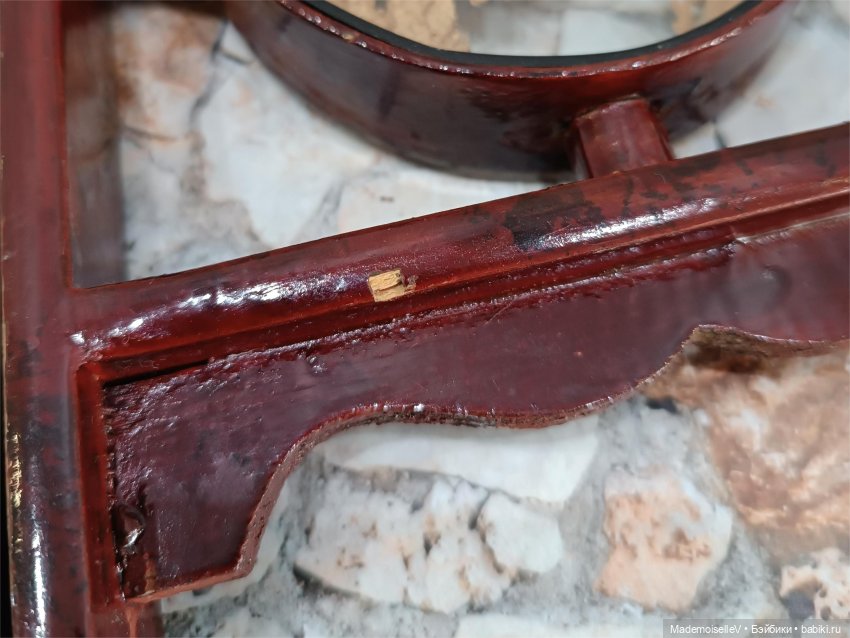Дерево створок окрашено в красно-коричневый цвет, покрытие неоднородное, есть более темные пятна, глянцевый лак. Петли крепкие.