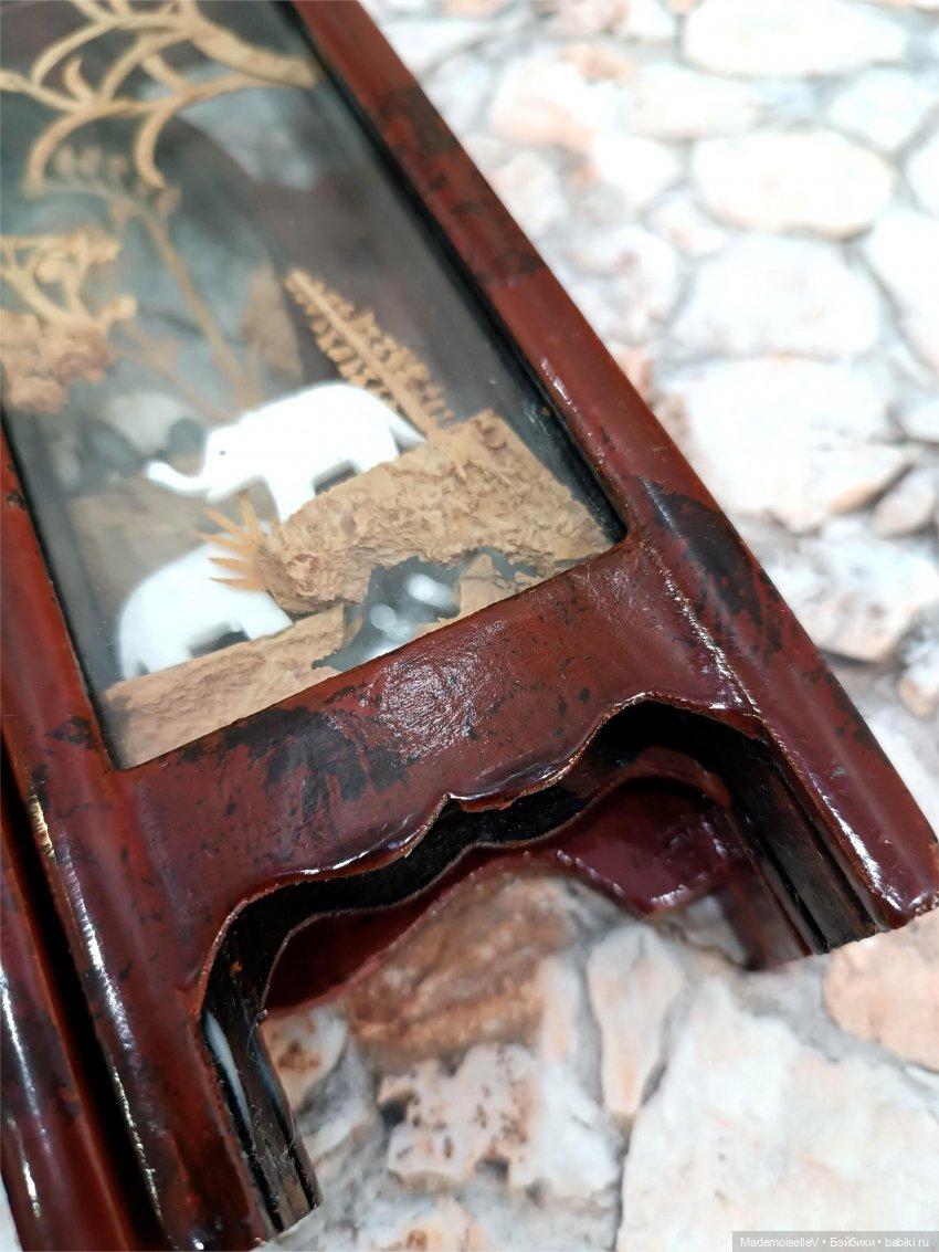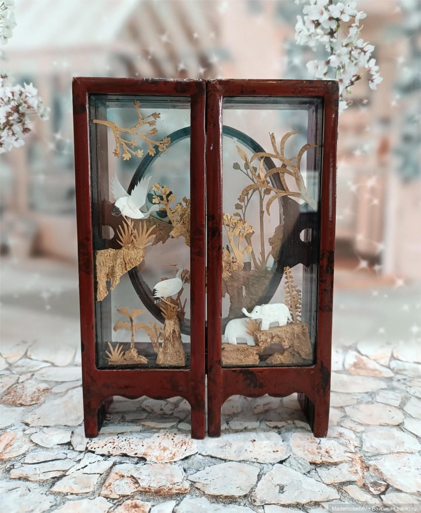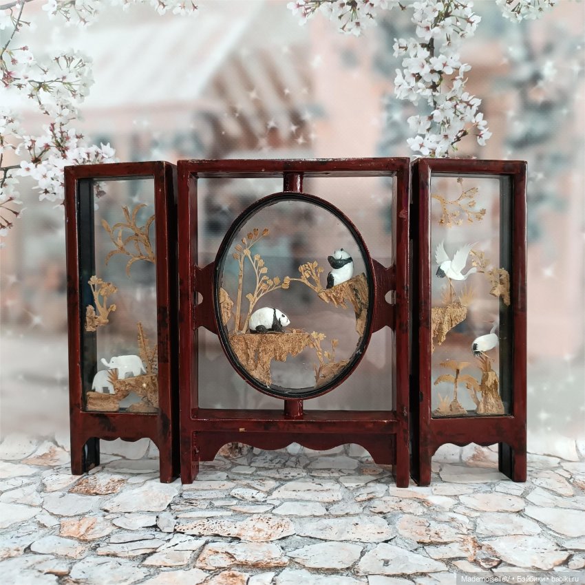 Редкий экземпляр, обычно резьбу по пробковому дереву оформляют в виде одностворчатого панно или диорамы, ширмы встречаются редко.