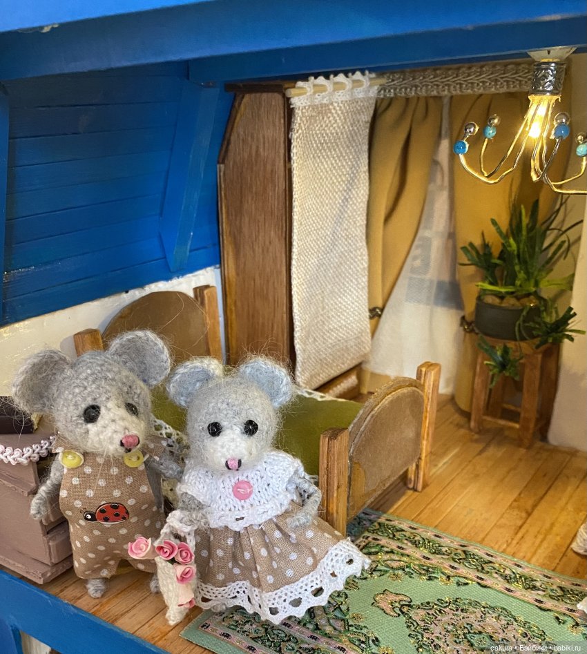 На первом этаже гостиная, есть камин (работает от батареек). Мансарда представлена как спальня. В домике имеется освещение внутреннее и внешнее, работает от батареек. Примерный масштаб 1:20, подходит для игрушек до 10 см. Все в домике сделано вручную, мебель можно переставлять, двери открываются. В подарок идёт пара мышек😊