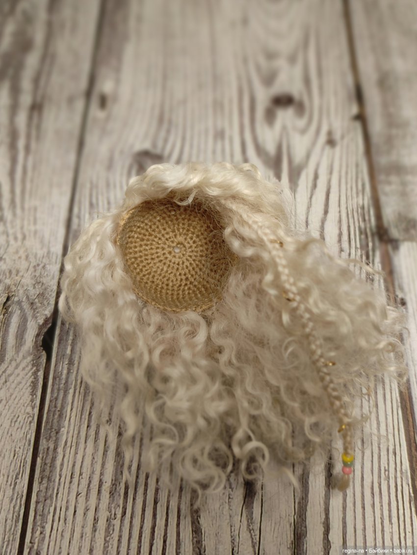 Парик клеевой из мягкой шерсти овечки. Парик лёгкий и совсем не утяжеляет голову куклы. Парик сидит уверенно и не нуждается в дополнительной фиксации, вязанная шапочка немного просилеконена для лучшего сцепления с головой куклы.
