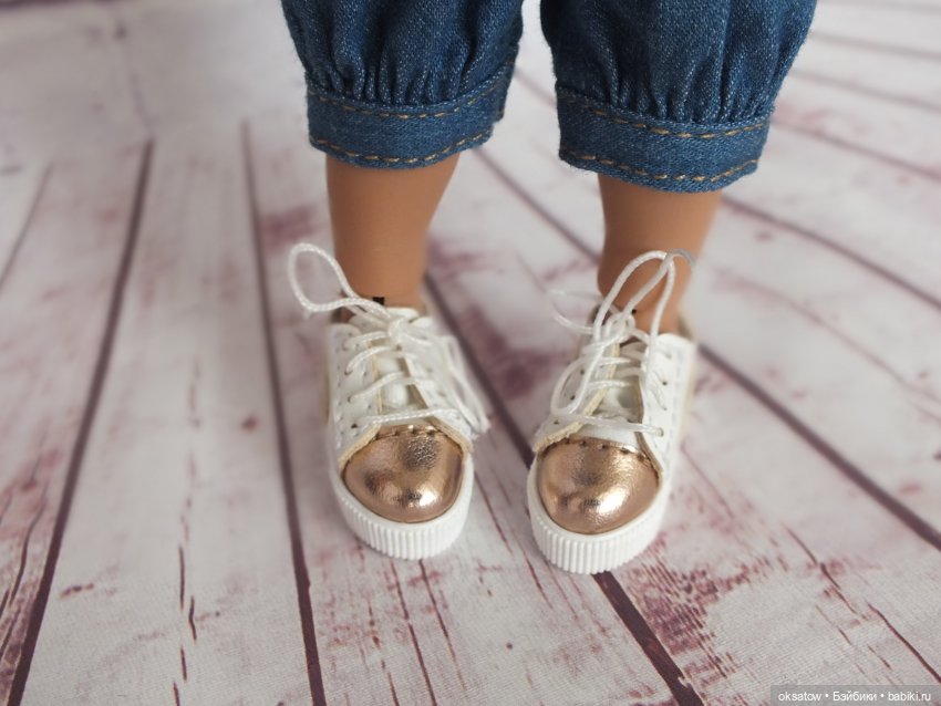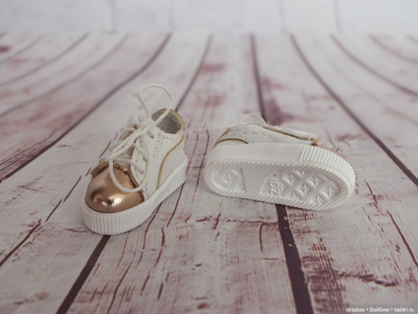 4) отличные кроссовки белого цвета с бронзовыми вставками, с реалистичной подошвой, на тонких шнурочках, размер по подошве 3 см * 1,3 см. Отлично на Lati Yellow, Twinkles Meadow, ирреаликов, на пукифи большеваты.
