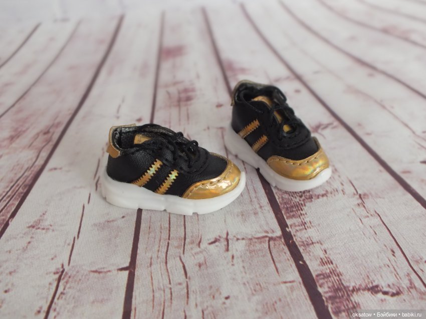 1) ПРОДАНО! кроссовки черного цвета с золотистыми деталями, с реалистичной подошвой, на тонких шнурочках, размер по подошве 3,2 см * 1,3 см. Отлично на Lati Yellow, Twinkles Meadow, ирреаликов, на пукифи большеваты.
