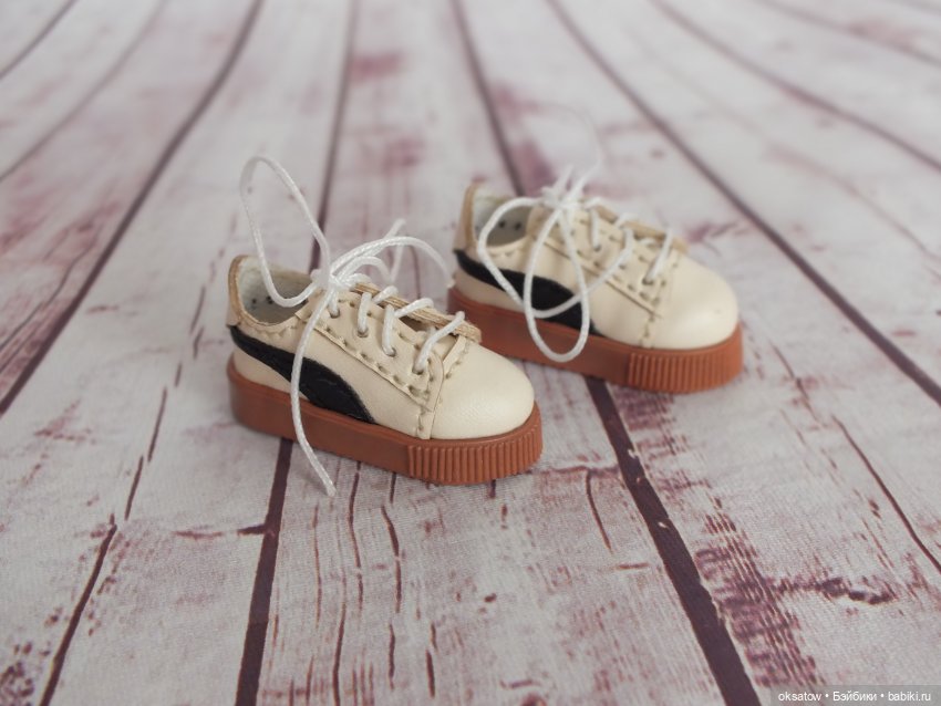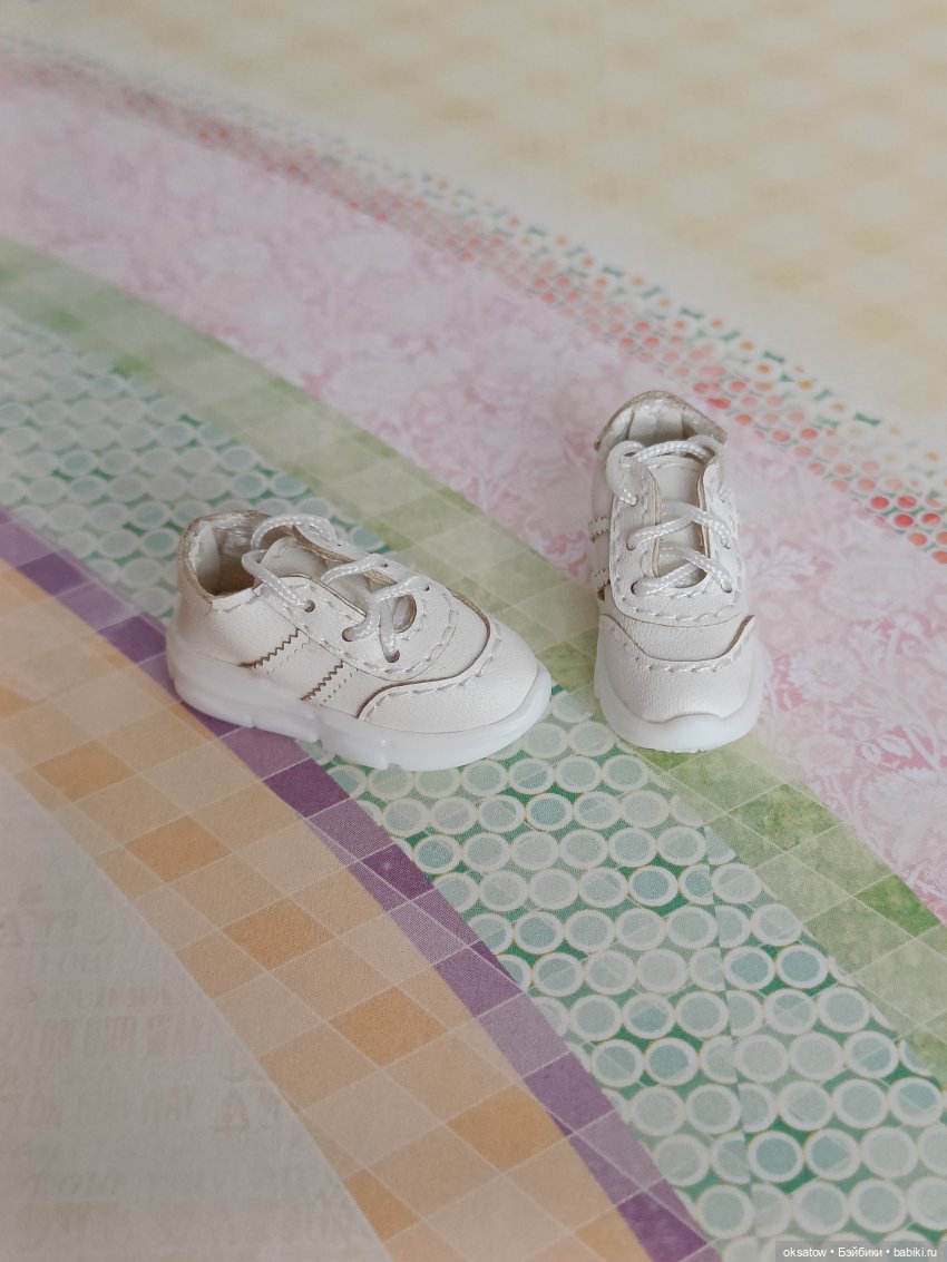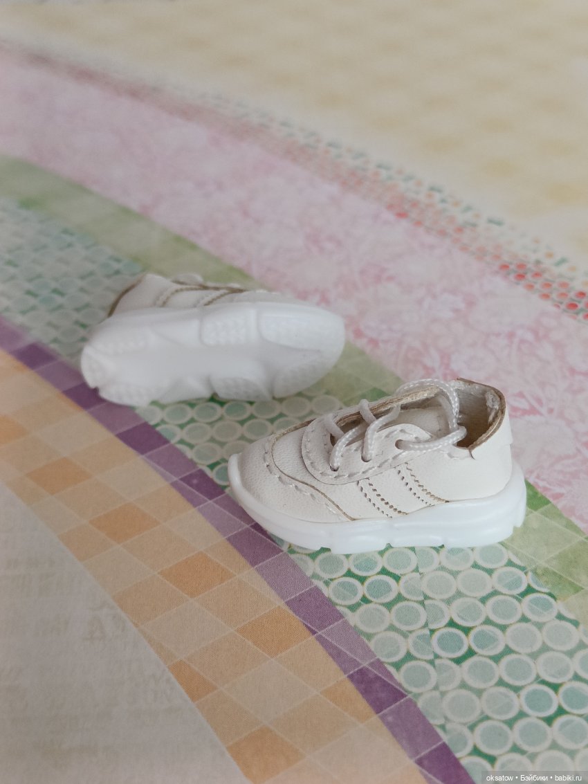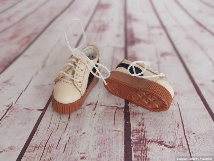 3) отличные кроссовки бежевого цвета, с реалистичной подошвой, на тонких шнурочках, размер по подошве 3 см * 1,3 см. Отлично на Lati Yellow, Twinkles Meadow, ирреаликов, на пукифи большеваты.