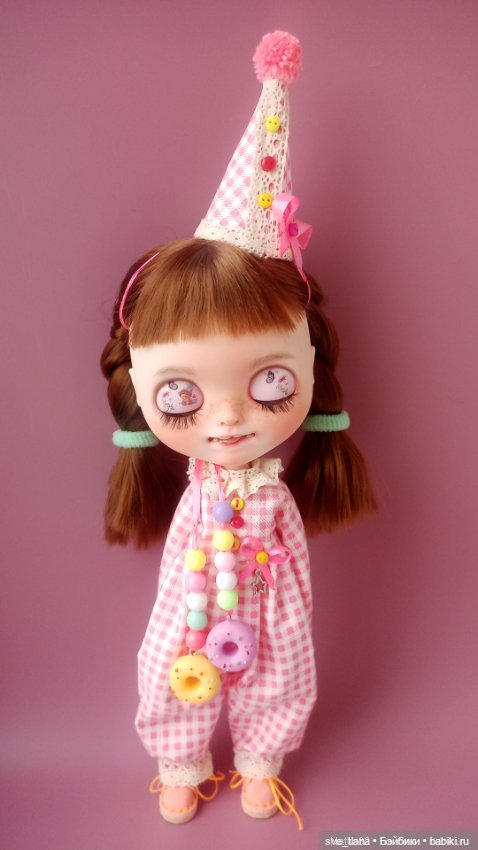 Покупала Сладкоежку у Natka82. Кастом выполнен на основе Блайз TBL: стеклянные чипы, карвинг, шлифовка, лепные части (аккуратный язычок), пулринги в виде пончиков. Роспись художественной пастелью закреплена клиром. Голова установлена на шейный шарнир — наклоняется/поворачивается (по-моему шарнир слабоват, точно не уверена т.к. это единственная блайз на шейном шарнире и я не знаю, как он должен работать, нюансом не считается, но я учла в цене). Волосы острижены мастером. Приедет в костюме клоунески (фото в комментарии ниже). Куклой не играли, на улицу не выносили (была сфотографирована по приезду и убрана в шкаф). Дополнительную информацию и фото/видео предоставлю по запросу.