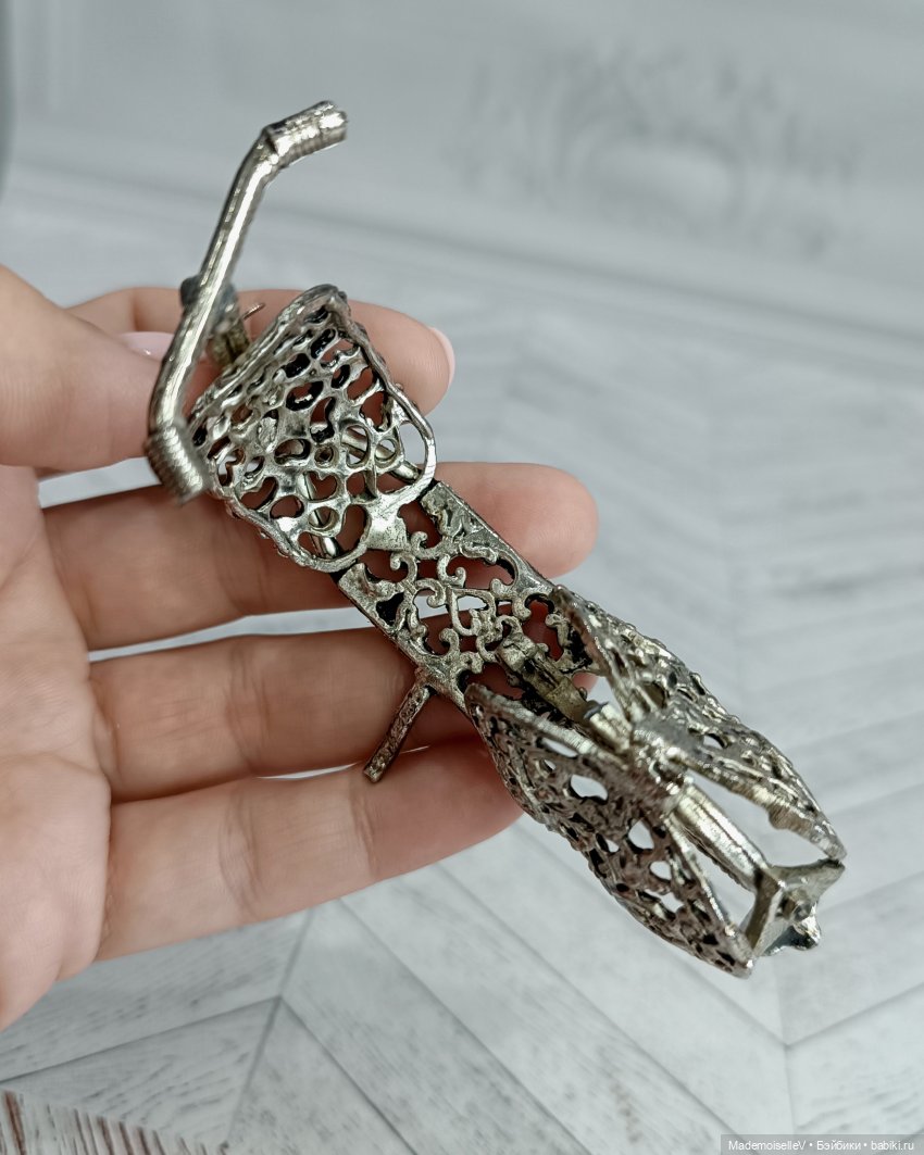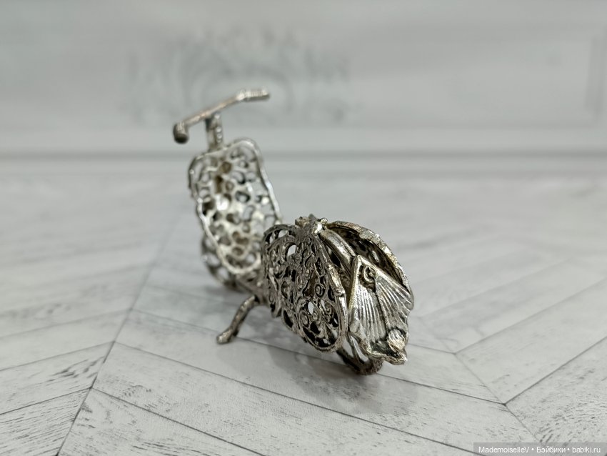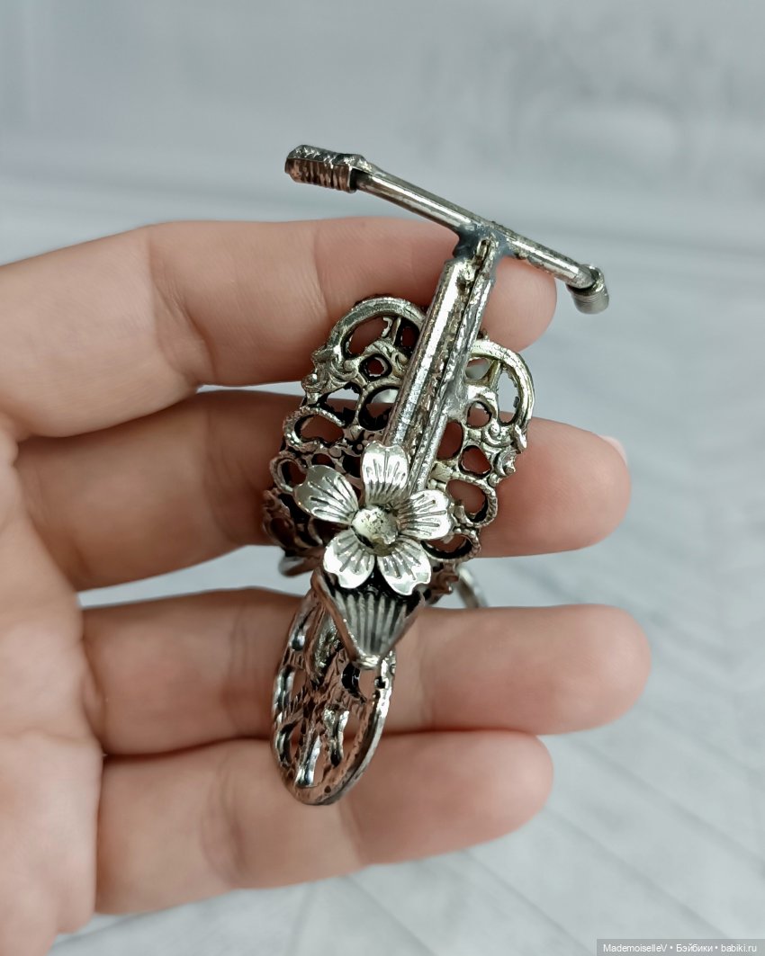 Прелестная вещица — коллекционный мопед из серебристого мельхиора с небольшим чернением. Ажурные сквозные узоры ювелирной филиграни. Впереди и сзади украшен цветочными мотивами. Винтаж.