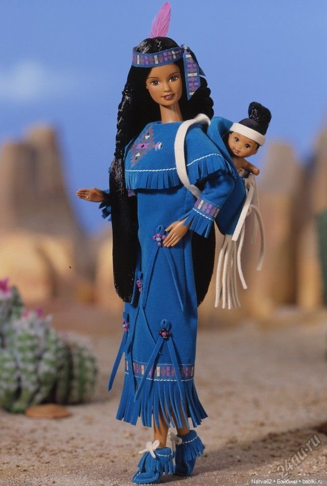Барби-индианка. Я не первый владелец, но состояние хорошее. Ноги гнутся на 2 щелчка, липкости нет. На косах от времени рассохлись резинки, не снимала. Перо на головной повязке пришло уже в таком состоянии. Аутфит, вероятно, родной, не снимала. Малыша и обуви в комплекте нет, продается в том, в чем на фото.