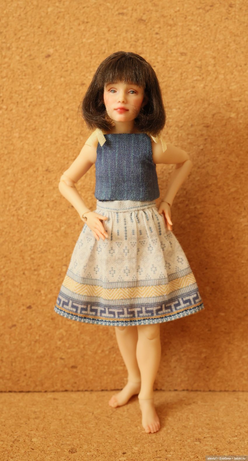 Брюнетка продаётся в сине-белом раздельном костюмчике. Белое платье с фото для примера. Обе куколки идут с дополнительной обувью и расчесочками.