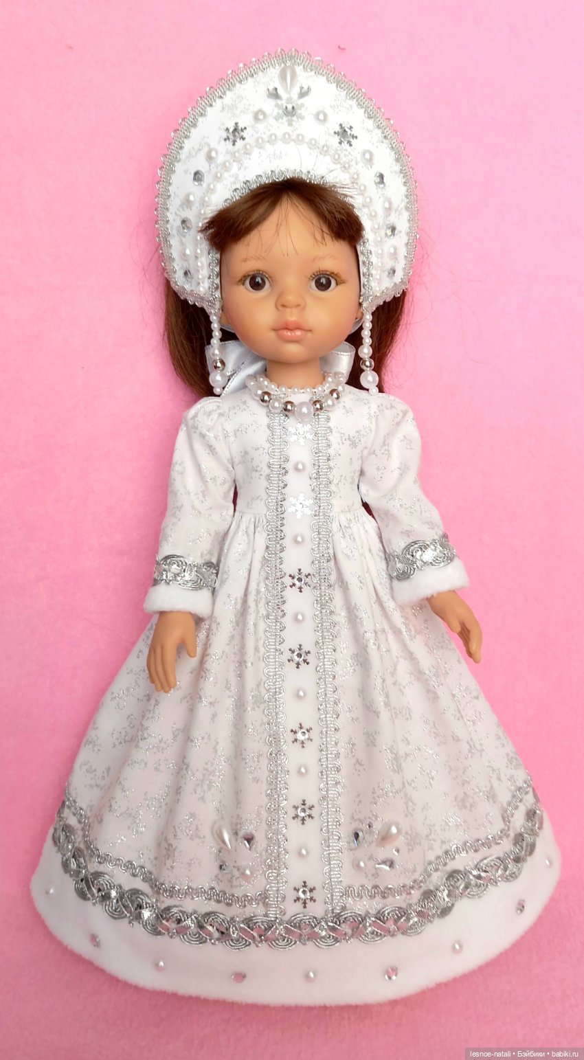 Платье и кокошник из американского хлопка с серебристым напылением. Отделка: флис, тесьма, пайетки, бусины, полубусины, лента. Лиф платья на подкладке, застёгивается на кнопки. Кокошник на резиночке + ленты.
