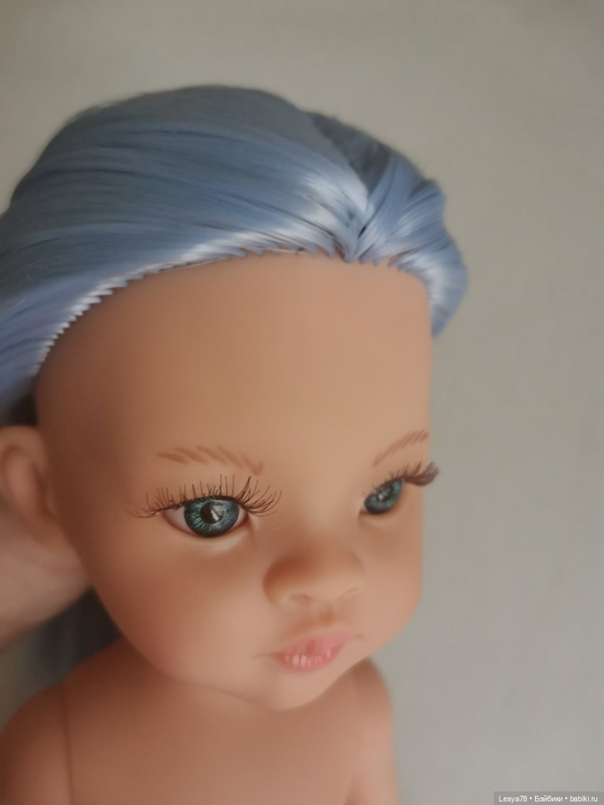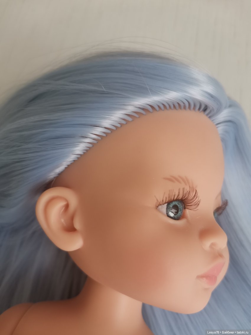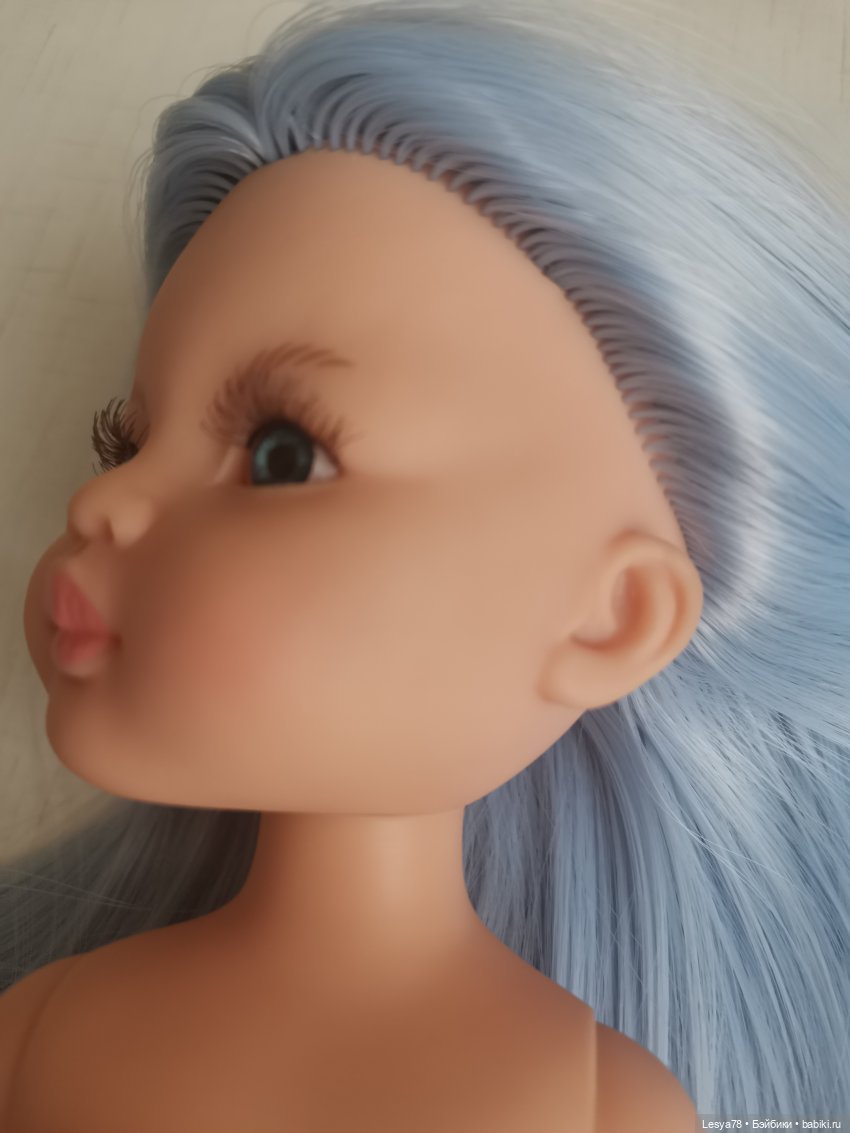 Куколка прошита искусственными трессами приятного голубого цвета. Длина — ниже трусиков. Волосы можно расчесывать. При укладке можно использовать фен или плойку на невысокой температуре.