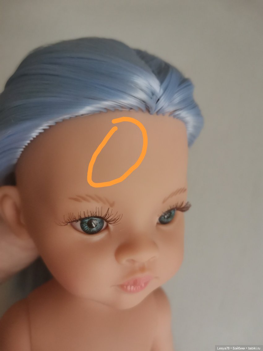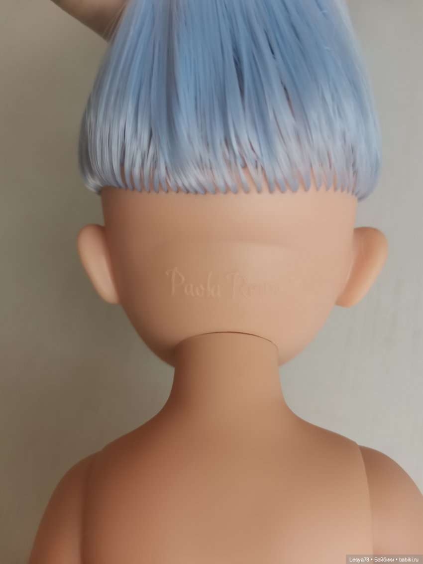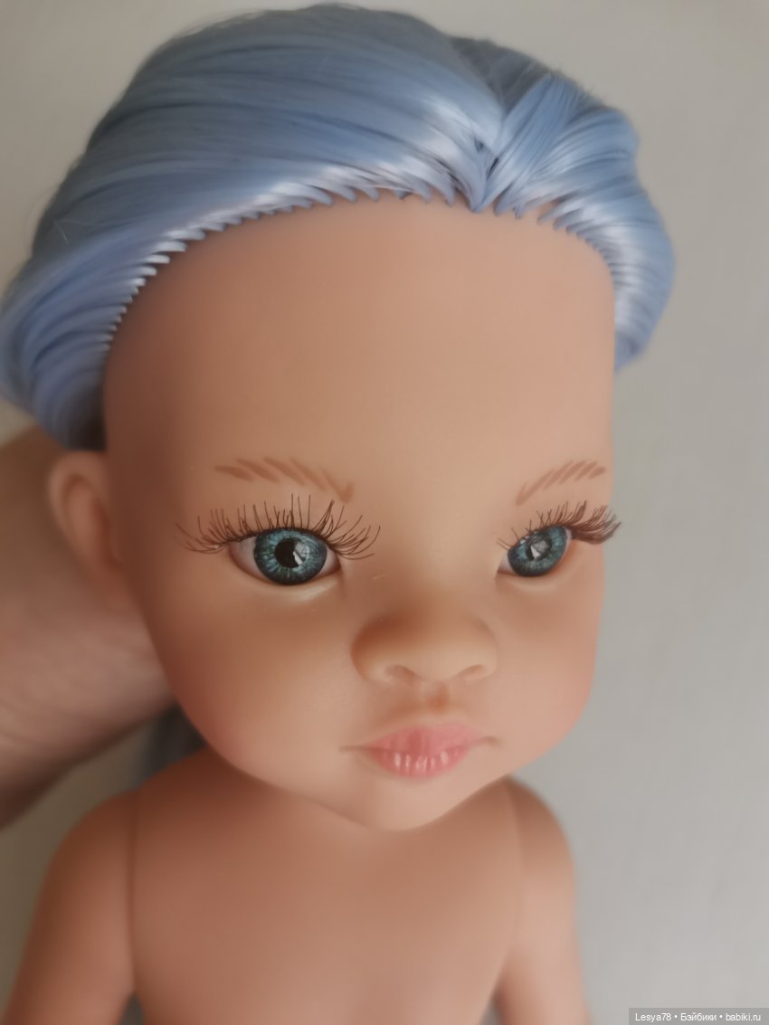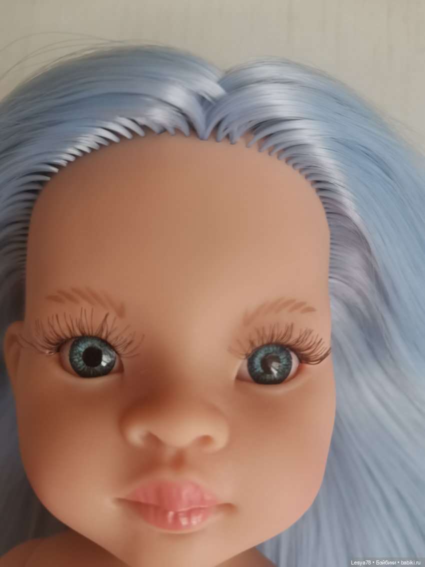 Куколка прошита искусственными трессами приятного голубого цвета. Длина — ниже трусиков. Волосы можно расчесывать. При укладке можно использовать фен или плойку на невысокой температуре.