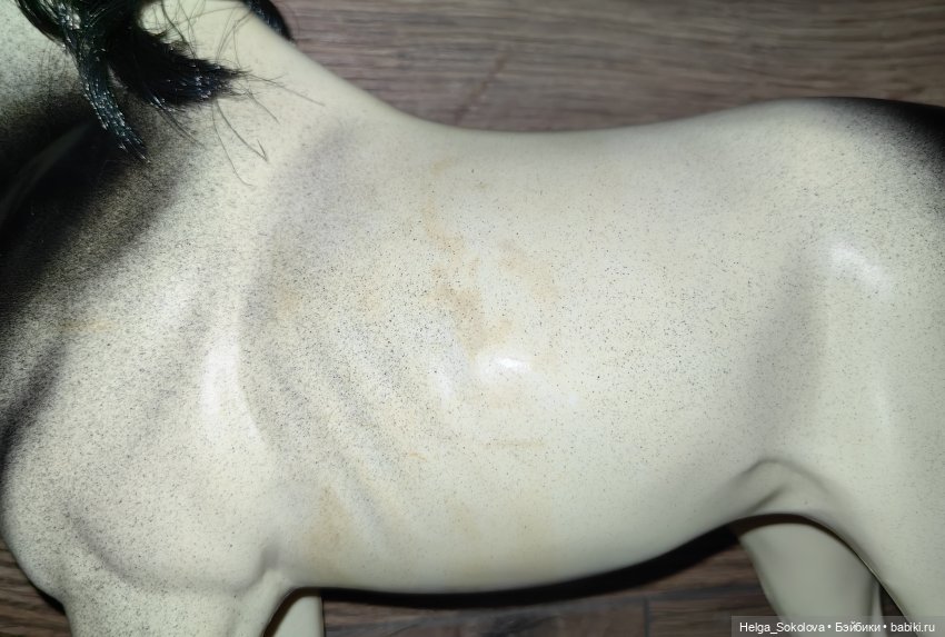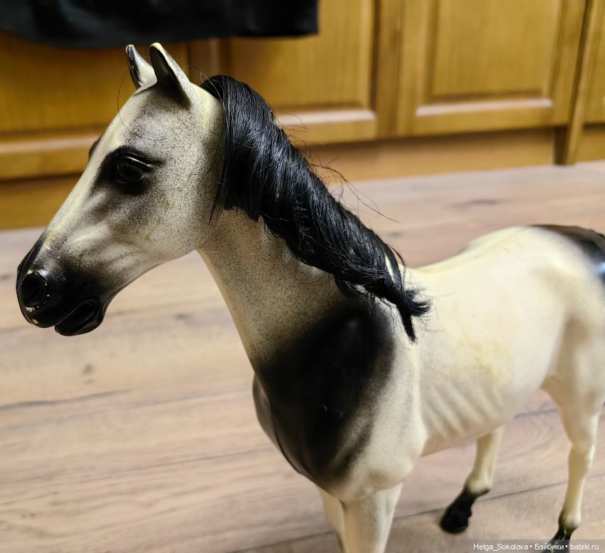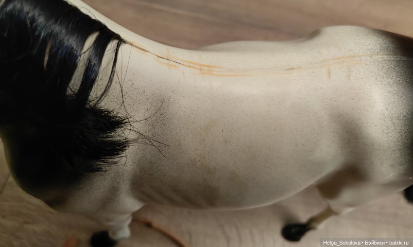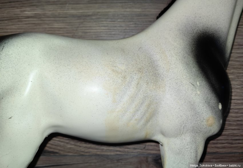 Состояние на фото. Трещин, сколов нет, есть окрасы от амуниции и царапины на красочном слое. Материал похож на целлулоид или АБС. Высота 32 см. по кончикам ушей. Стоит уверенно.
