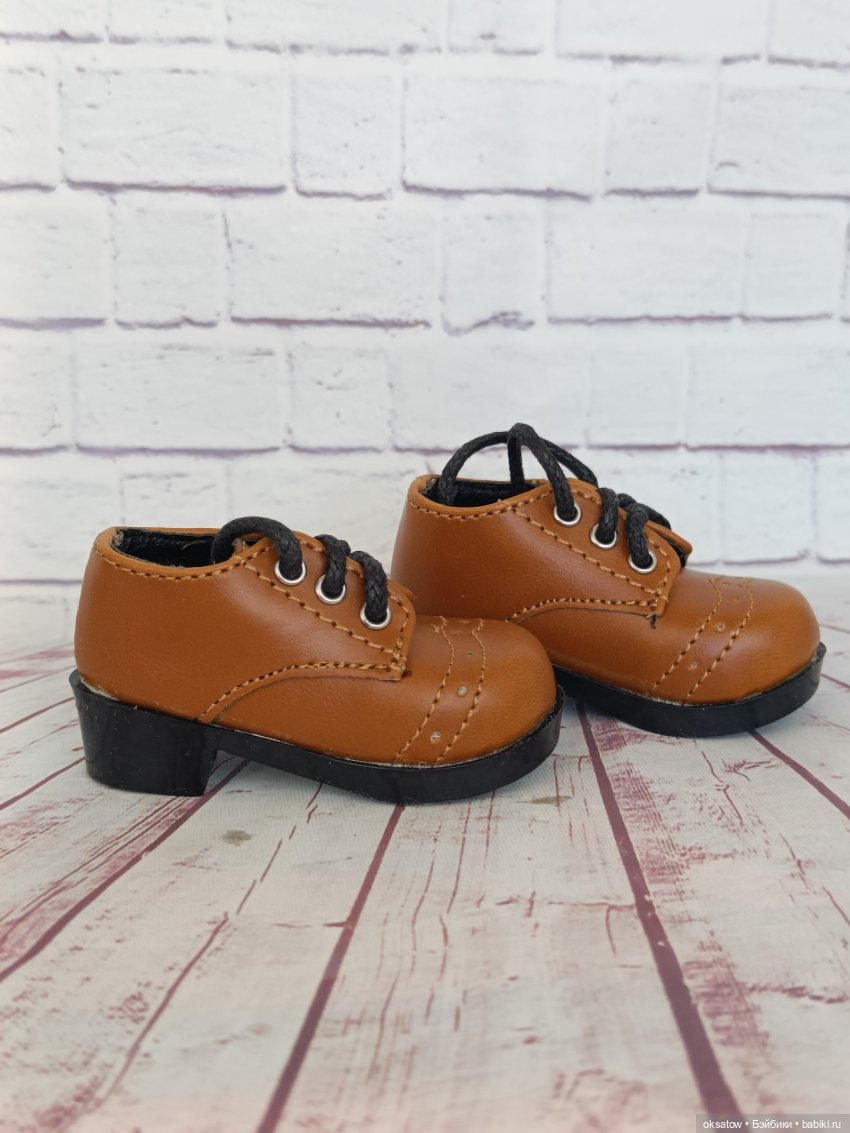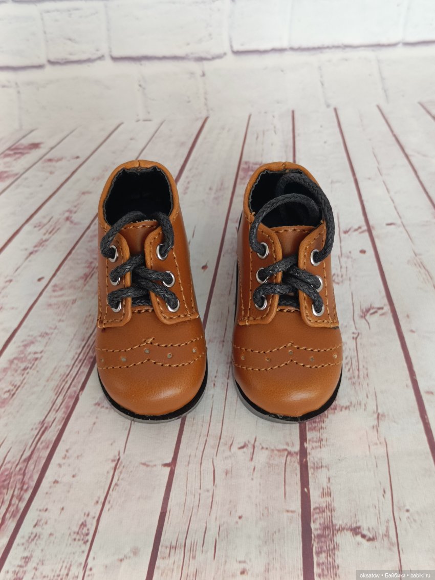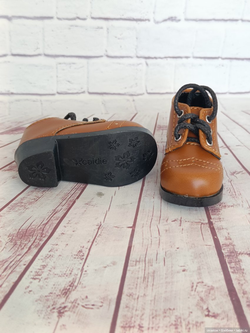 2) коричневые классические ботинки на шнурках, материал похож на кожу, новые. Размеры по подошве 6,8 см * 3 см.