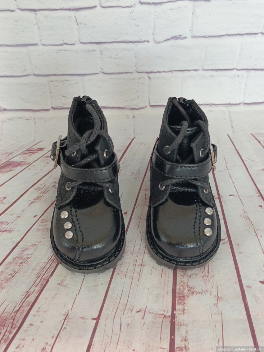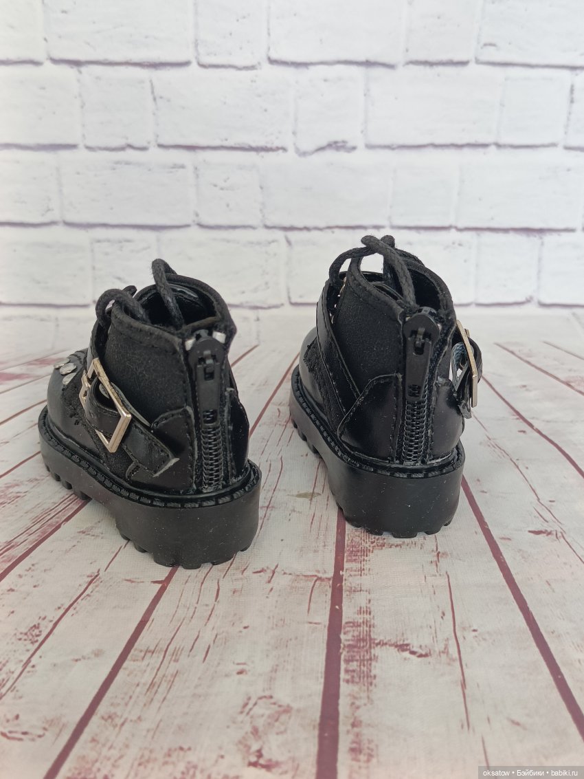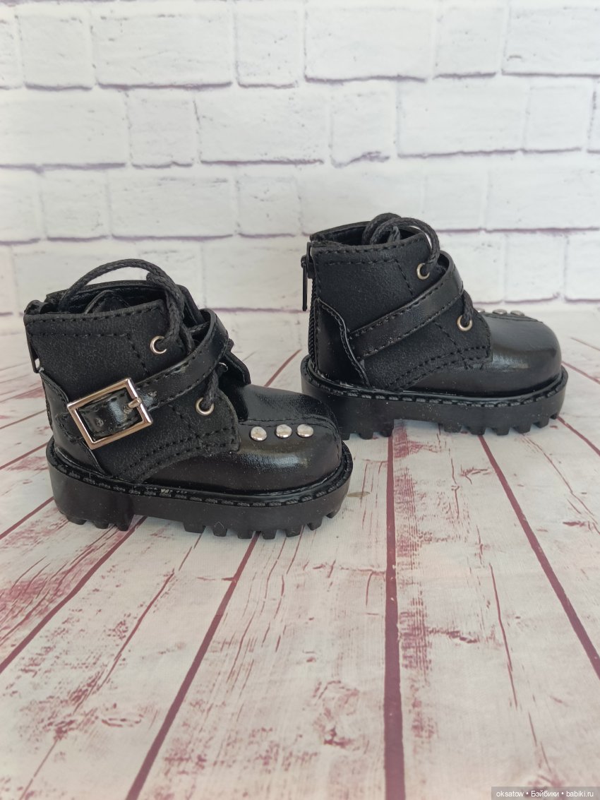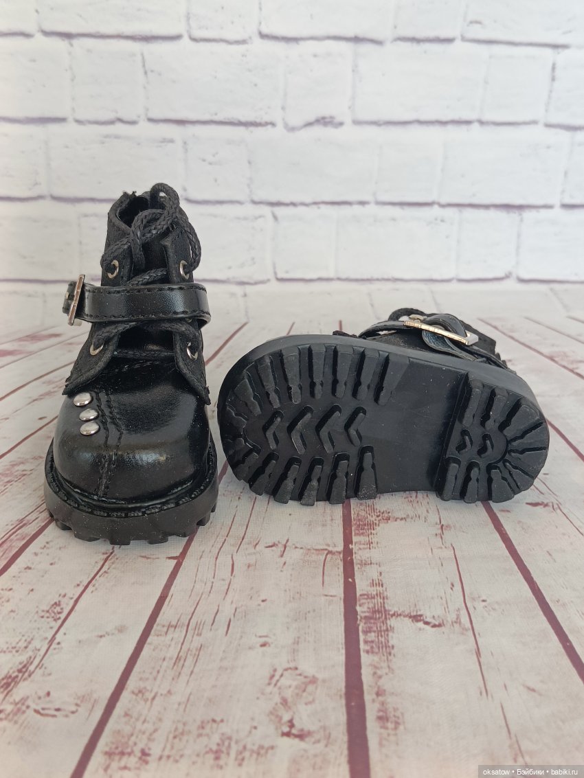 3) черные ботинки с клепками и тяжелой тракторной подошвой, сзади застёжка молния, сверху шнуровка. Размеры по подошве 7 см * 3,5 см.