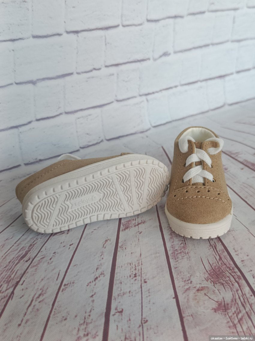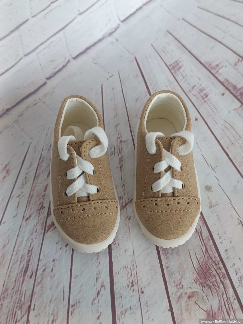 1) бежевые кеды на шнурках, материал под кожаный велюр, новые. Размеры по подошве 7,2 см * 3 см.