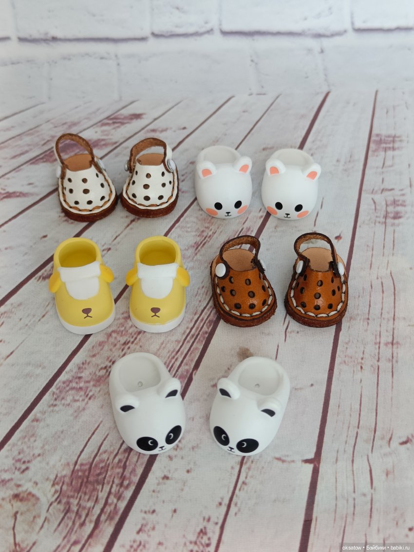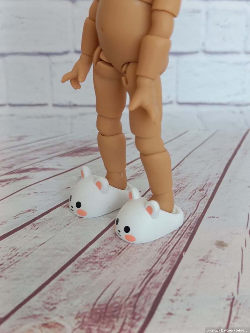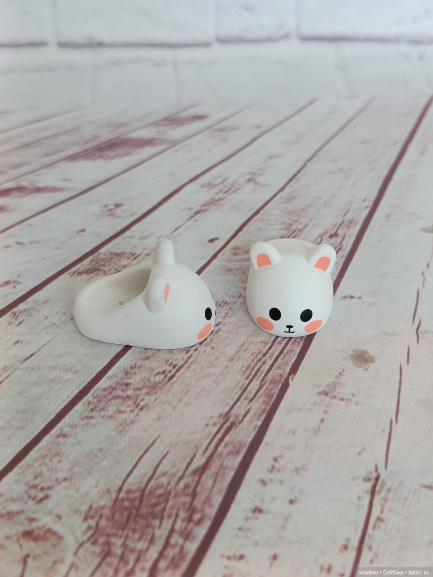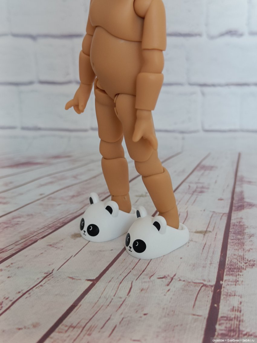 5) белые тапочки-сабо с мордочкой панды, из пластика, на подошве впаян магнит для устойчивости куклы. Размеры по подошве 2,3 см * 1,2 см.